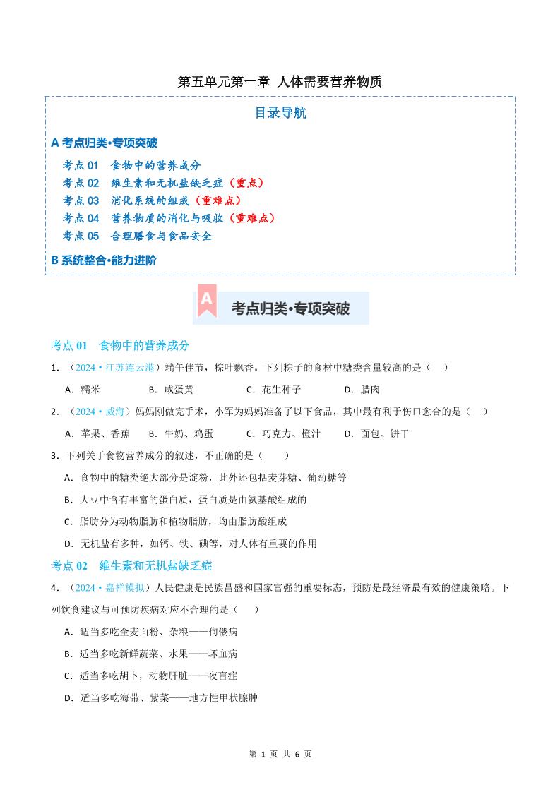 第5单元第1章 人体需要营养物质(专项训练)(原卷版)