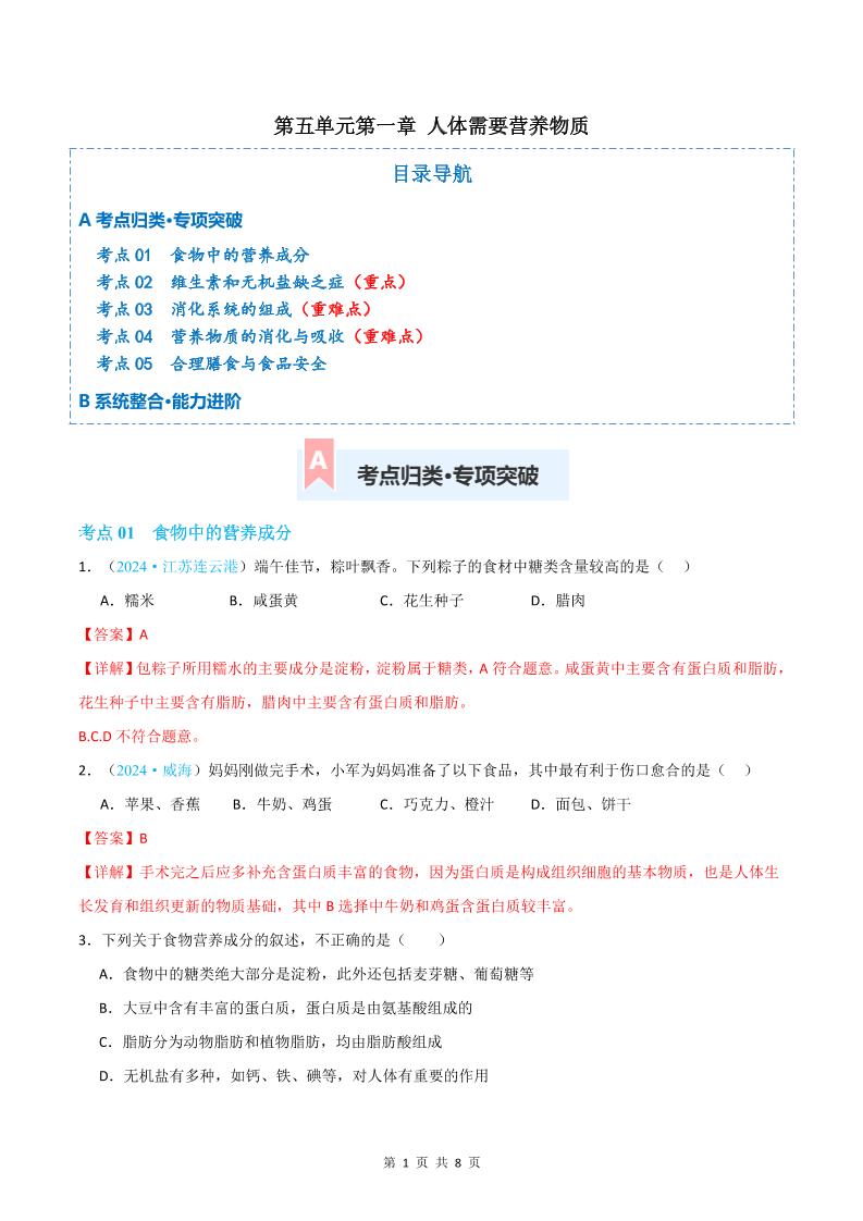 第5单元第1章 人体需要营养物质(专项训练)(解析版)