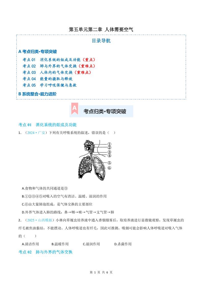 第5单元第2章 人体需要空气(专项训练)(原卷版)