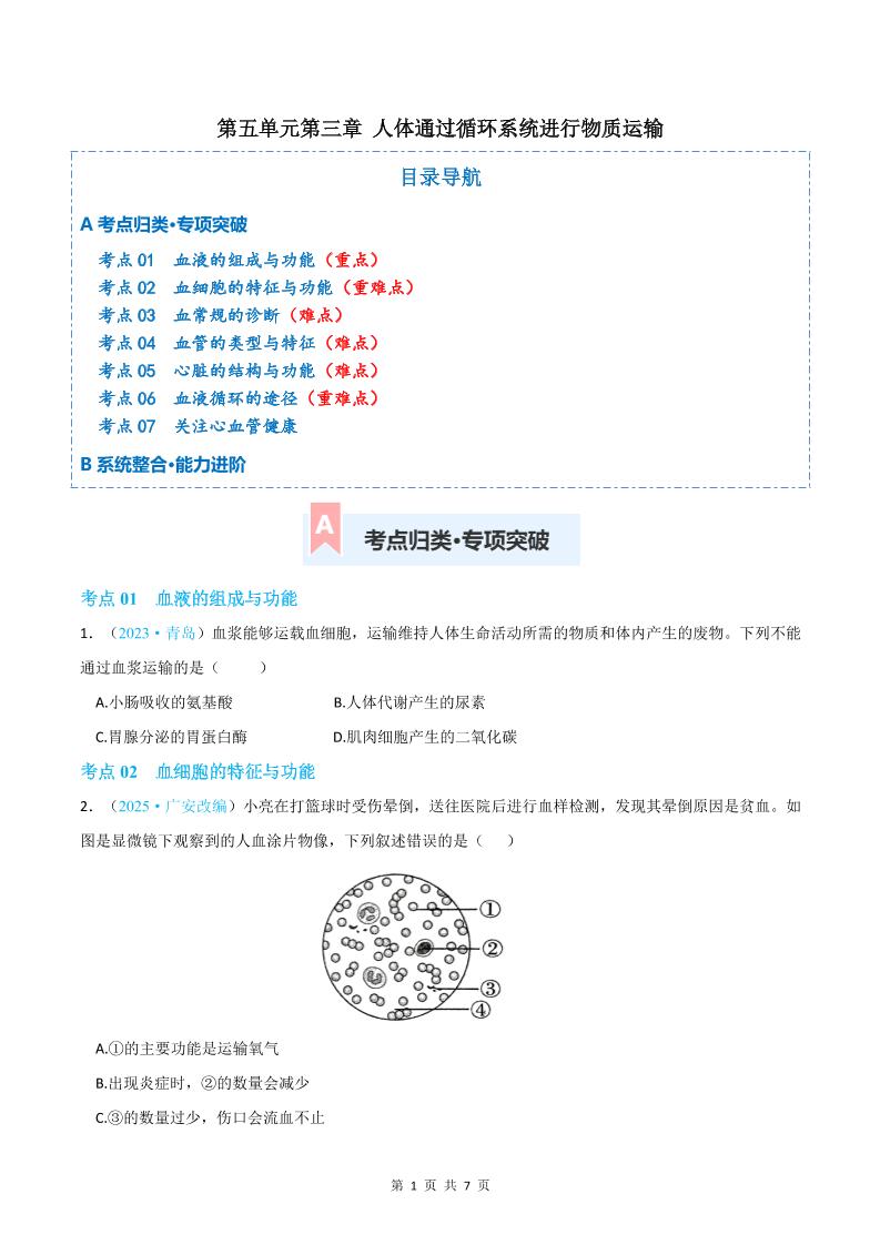 第5单元第3章 人体通过循环系统进行物质运输(专项训练)(原卷版)
