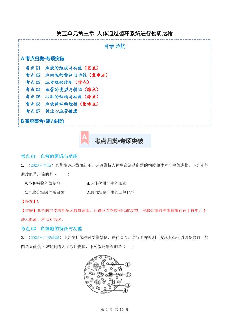 第5单元第3章 人体通过循环系统进行物质运输(专项训练)(解析版)
