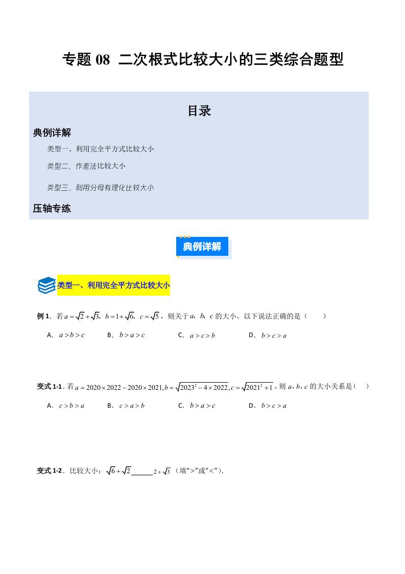 专题08 二次根式比较大小的三类综合题型(压轴题专项训练)(学生版)