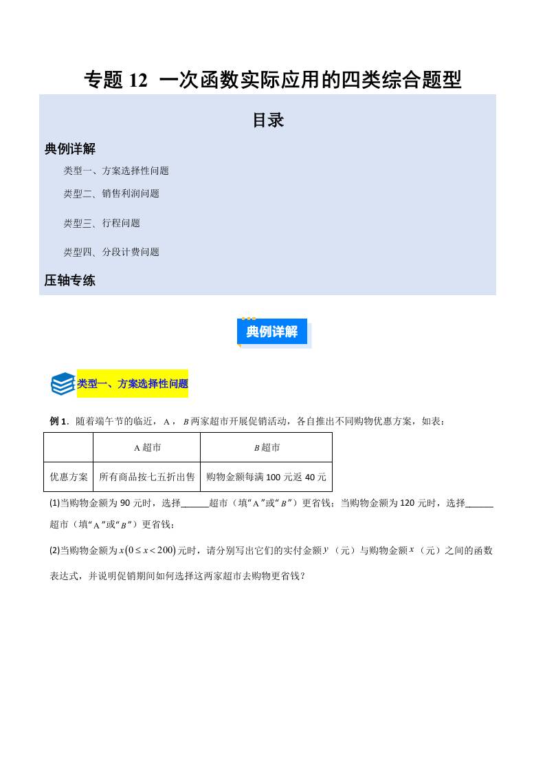 专题12 一次函数实际应用的四类综合题型(压轴题专项训练)(学生版)