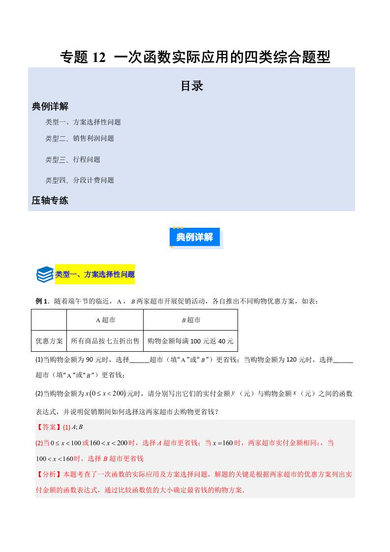专题12 一次函数实际应用的四类综合题型(压轴题专项训练)(教师版)