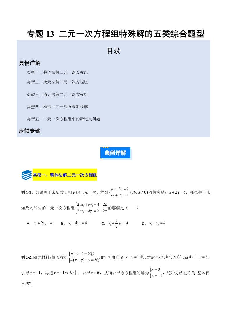 专题13 二元一次方程组特殊解的五类综合题型(压轴题专项训练)(学生版)