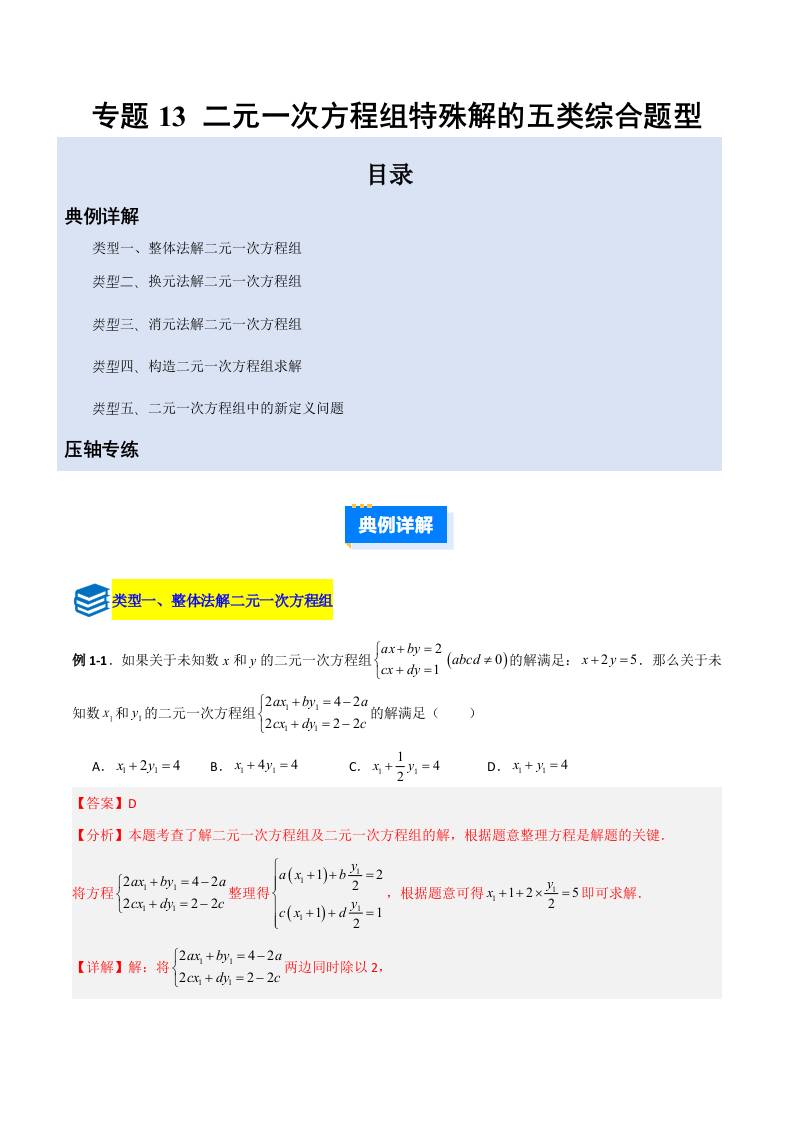 专题13 二元一次方程组特殊解的五类综合题型(压轴题专项训练)(教师版)