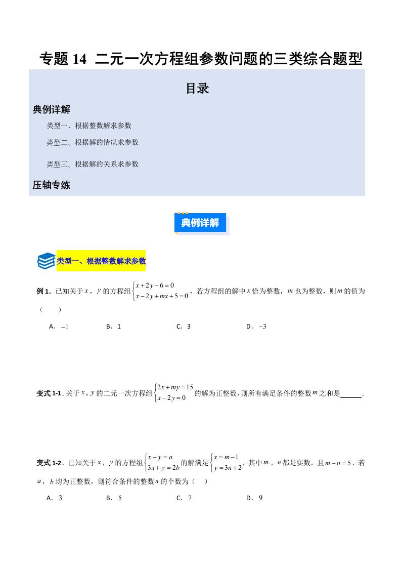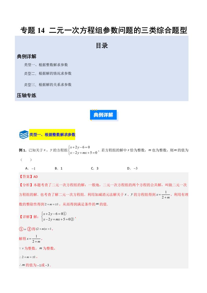 专题14 二元一次方程组参数问题的三类综合题型(压轴题专项训练)(教师版)