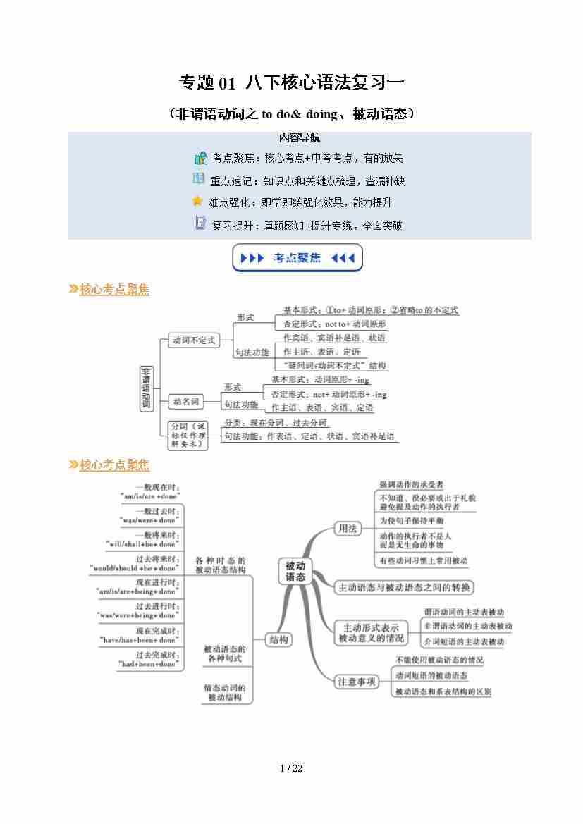第1部分 复习 专题01 八下核心语法复习一(非谓语动词之to do--doing和被动语态)(学生版)-2025年新九年级英语暑假衔接(沪教版)
