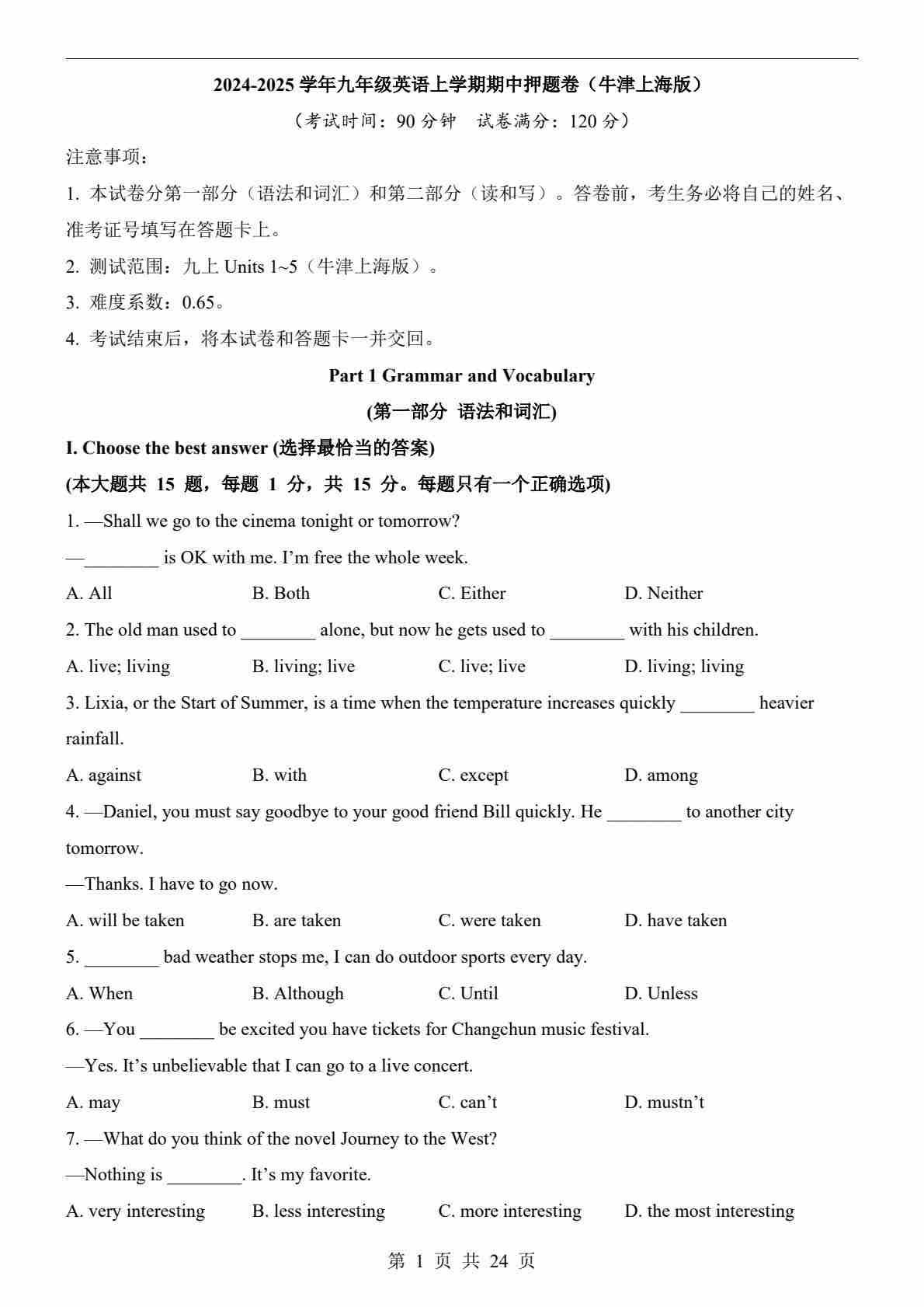【上海】9上英语期中卷【U1-5】