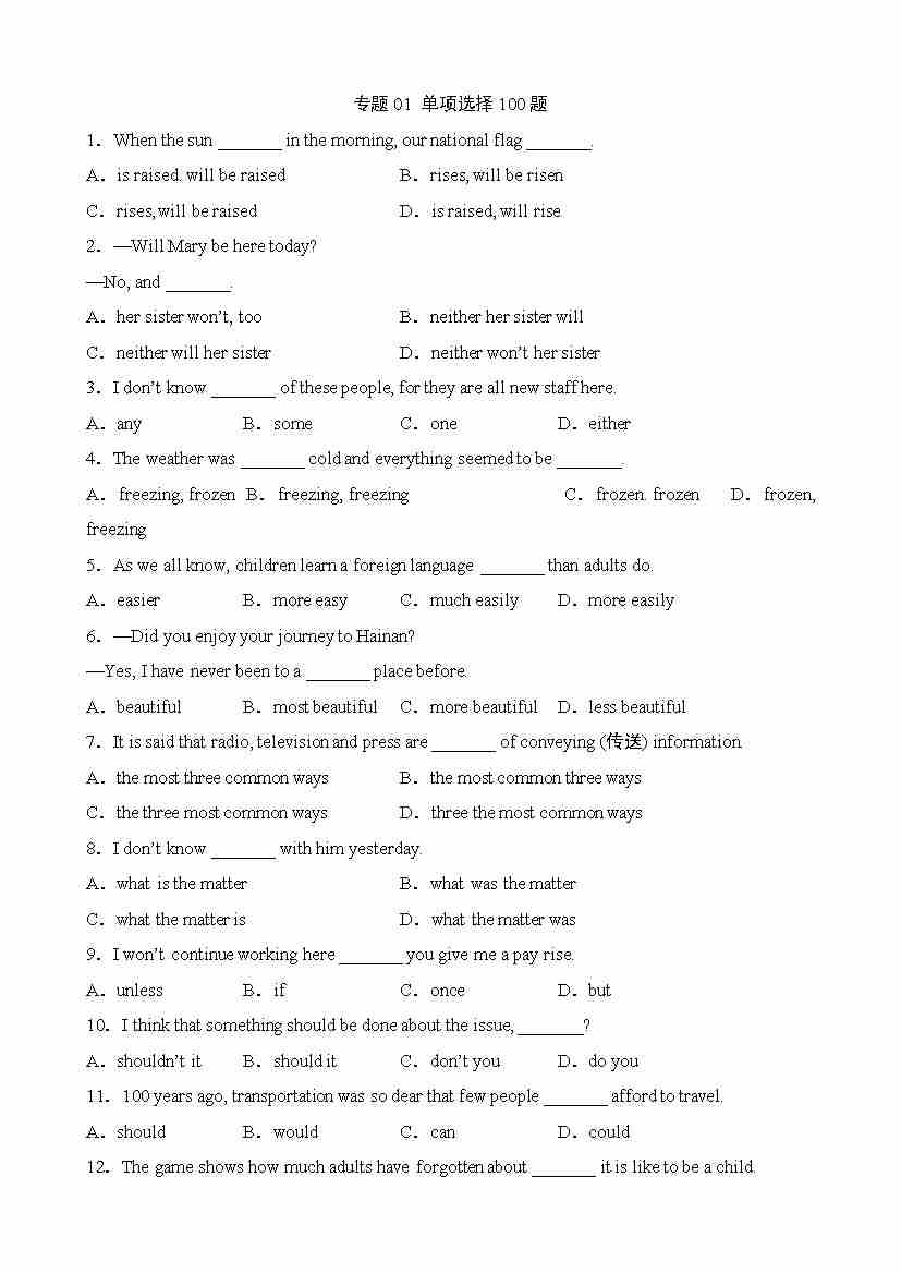 专题01 单项选择100题---