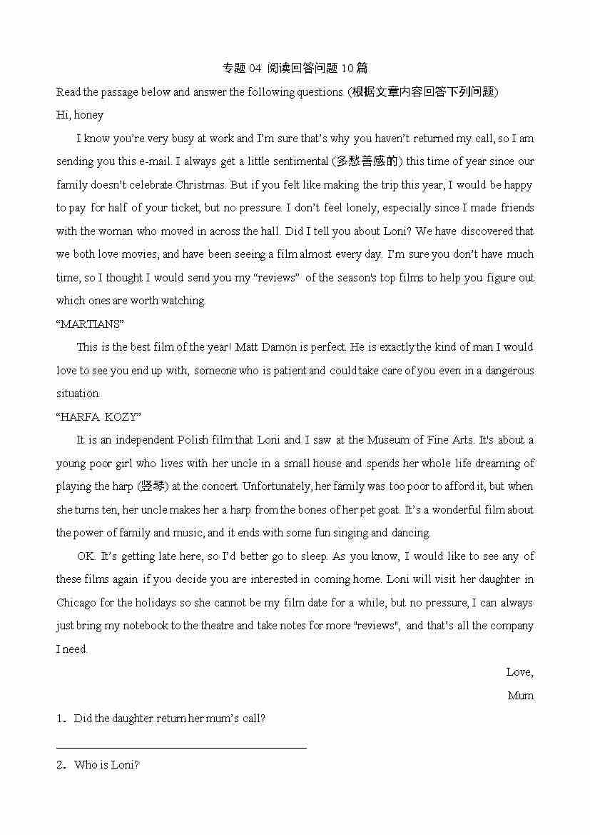 专题04 阅读回答问题10篇