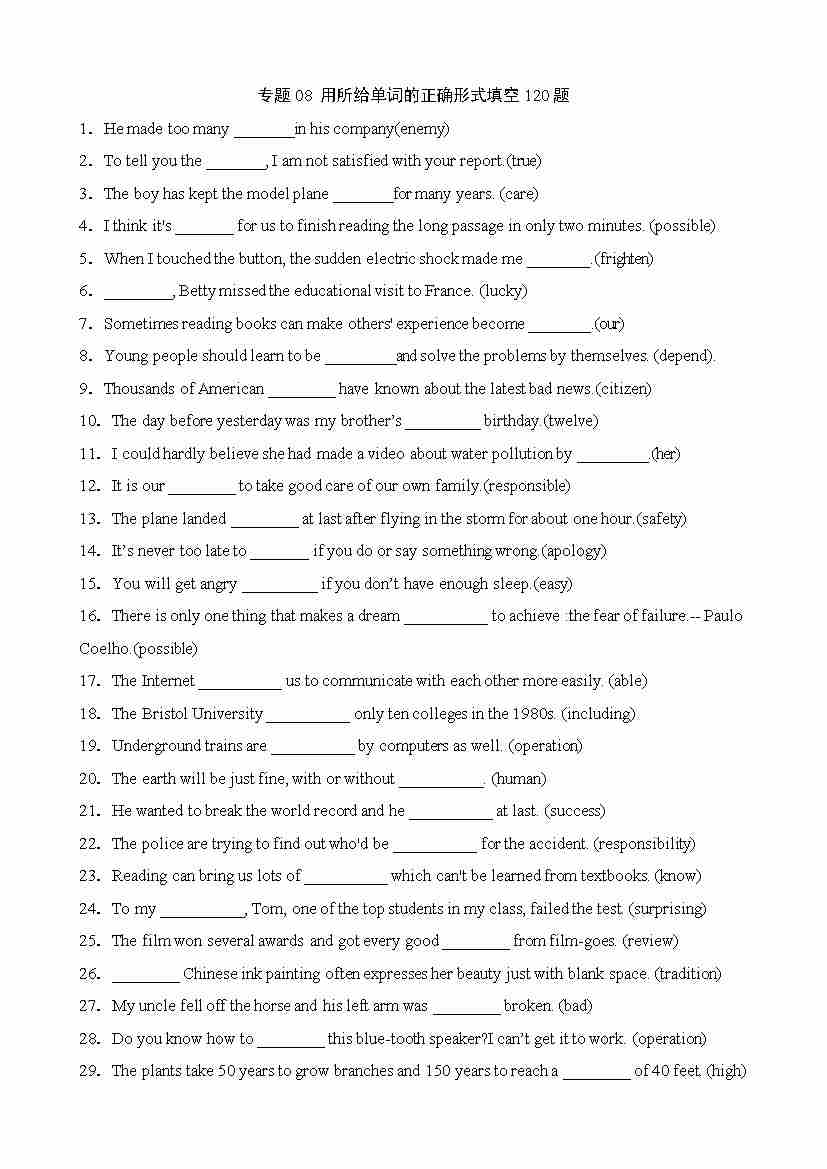 专题08 用所给单词的正确形式填空120题