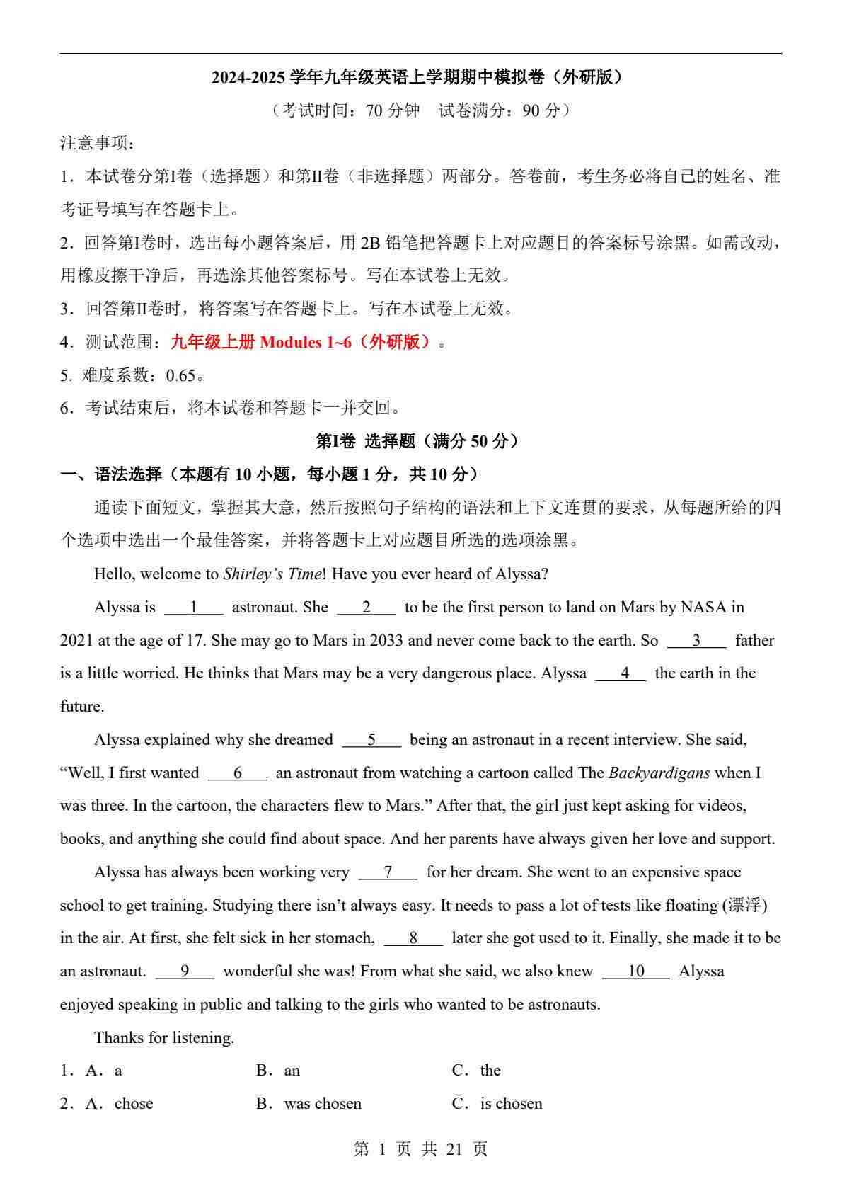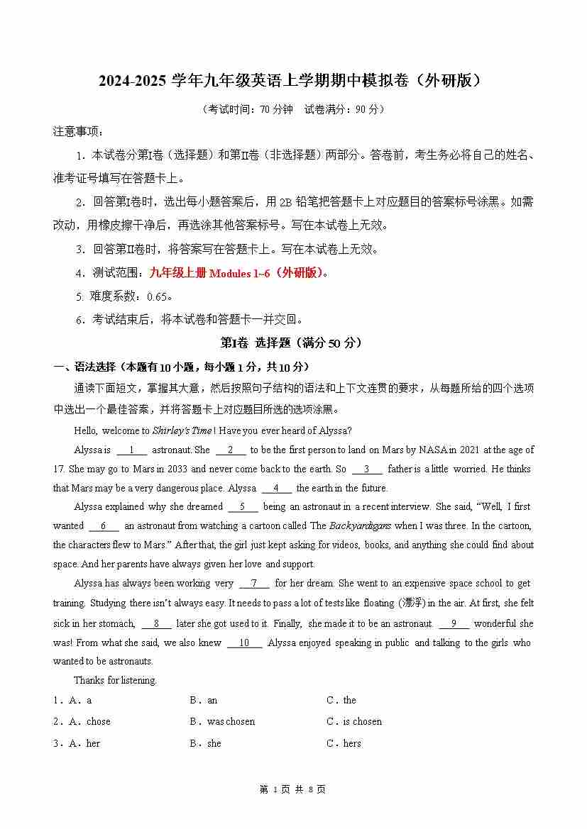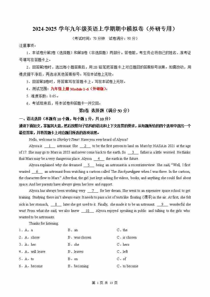 九年级英语期中模拟卷(考试版A4)【测试范围:九上Modules 1~6】(外研版)