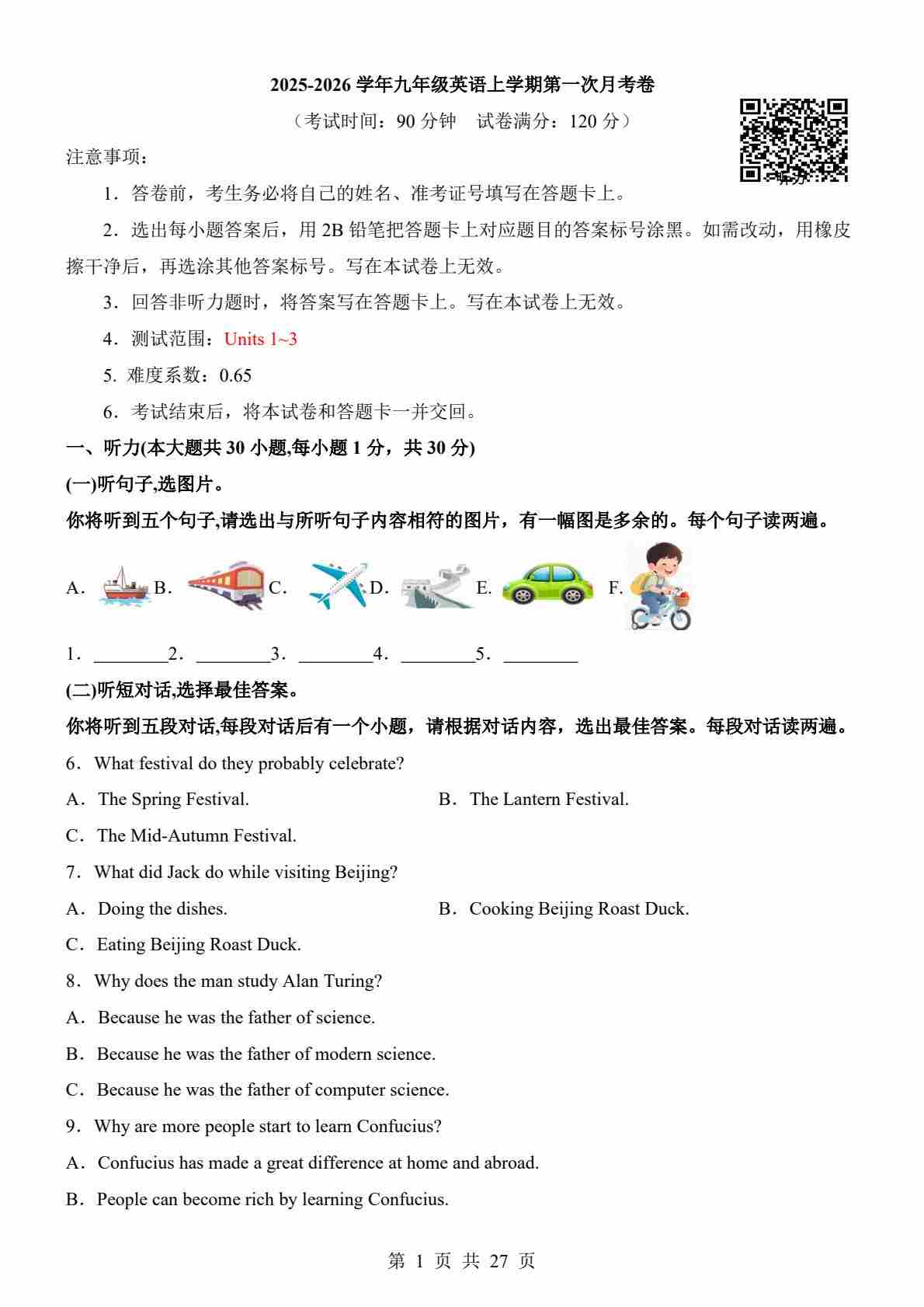 【外研】9上英语第1次月考【U1-3】