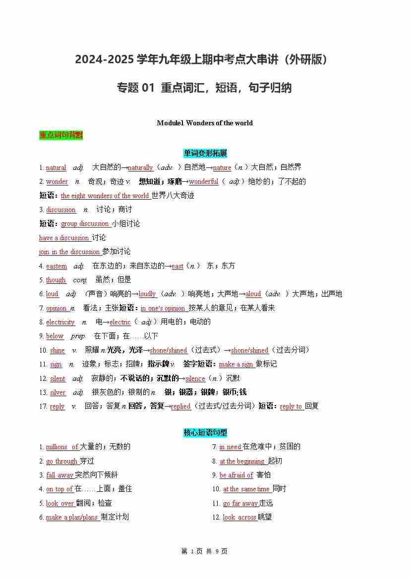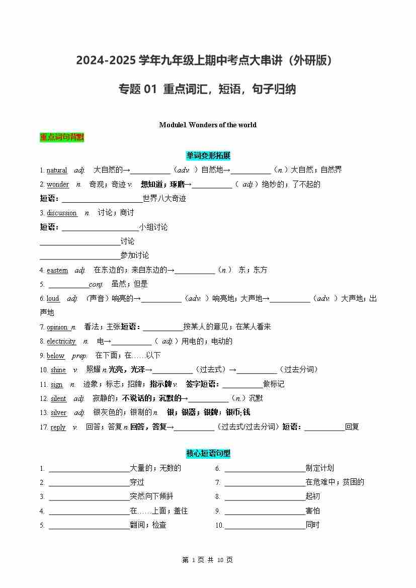 专题01 重点词汇,短语,句子归纳【考点清单】(外研版)(记忆版)