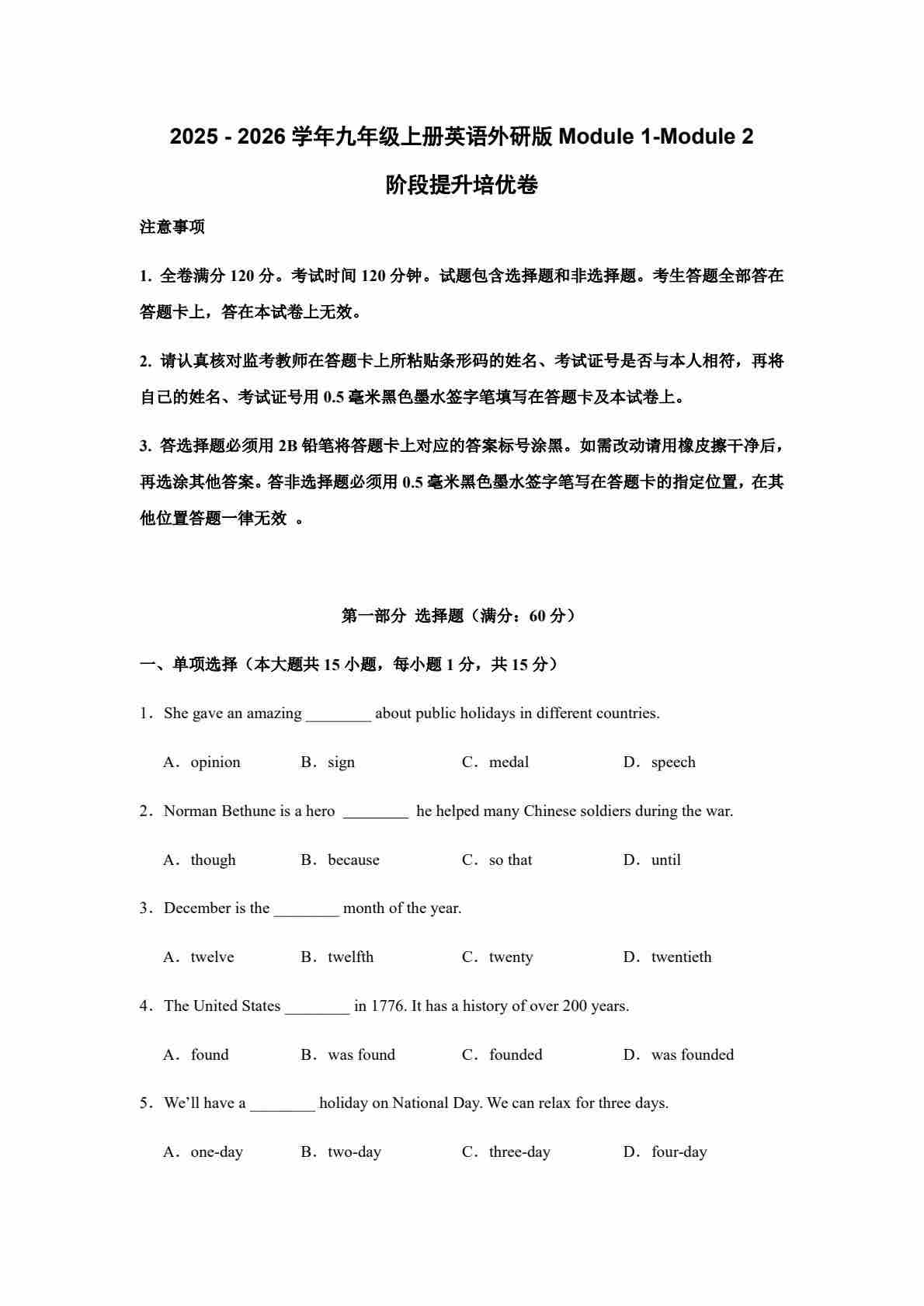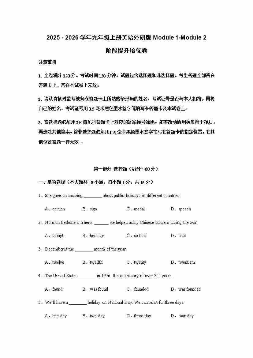 (月考培优卷)Module 1-Module 2 阶段检测培优卷(含答案解析)-2025 - 2026学年九年级上册英语外研版.