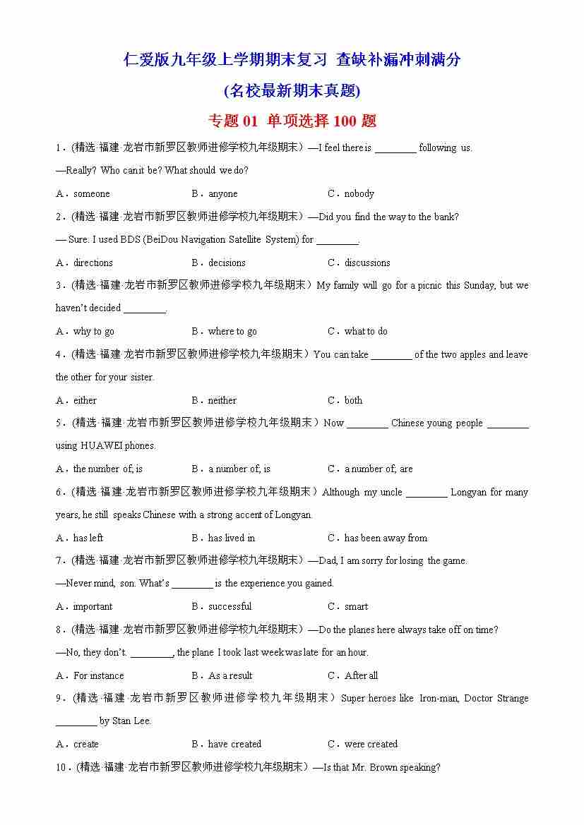 专题01 单项选择100题(名校最新期末真题)-九年级英语上学期期末复习查缺补漏冲刺满分(仁爱版)
