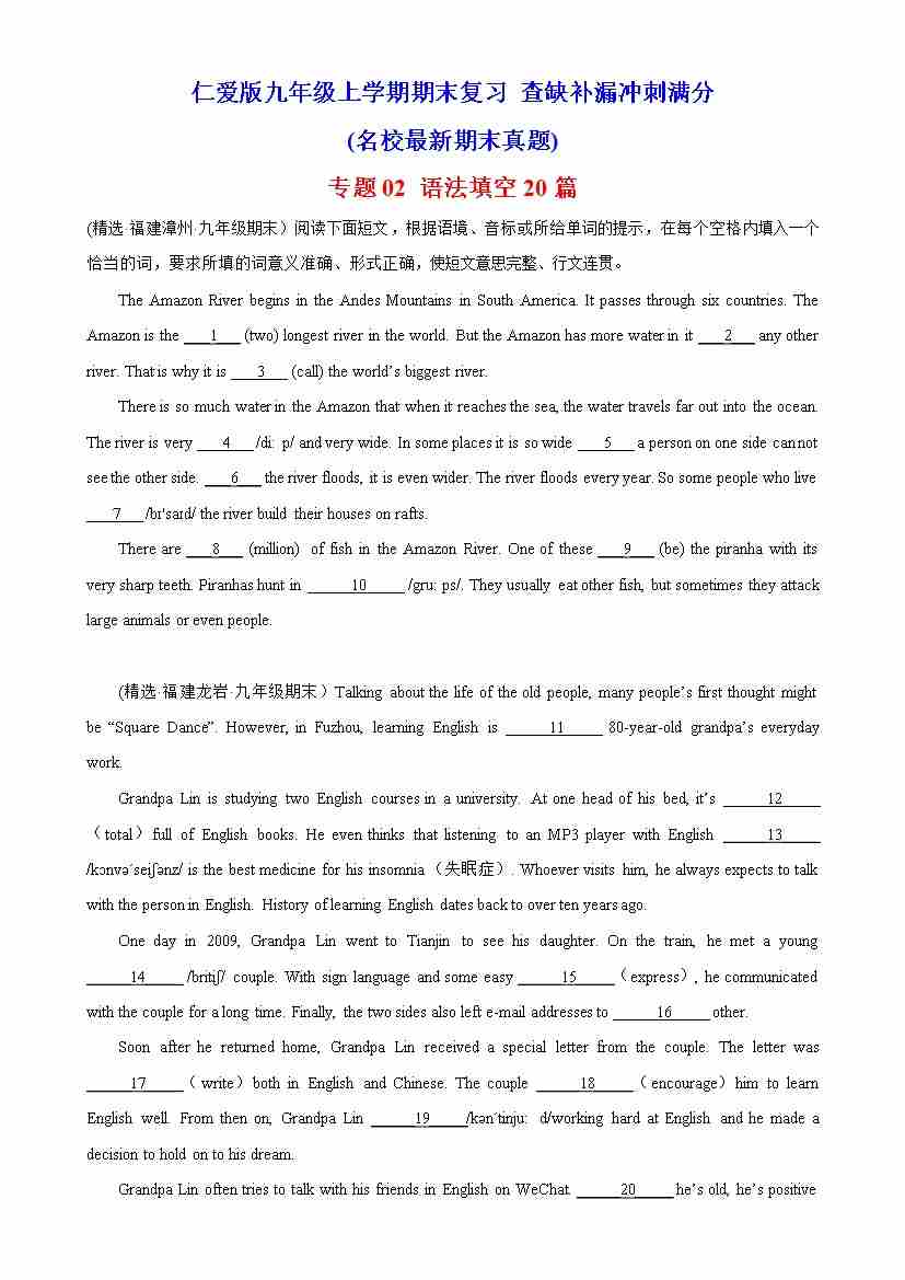 专题02 语法填空20篇(名校最新期末真题)-九年级英语上学期期末复习查缺补漏冲刺满分(仁爱版)