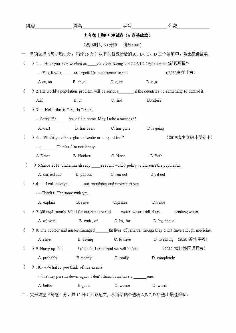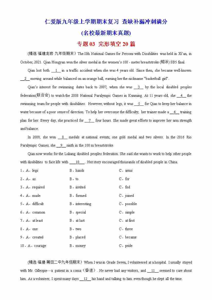 专题03 完形填空20篇(名校最新期末真题)-九年级英语上学期期末复习查缺补漏冲刺满分(仁爱版)
