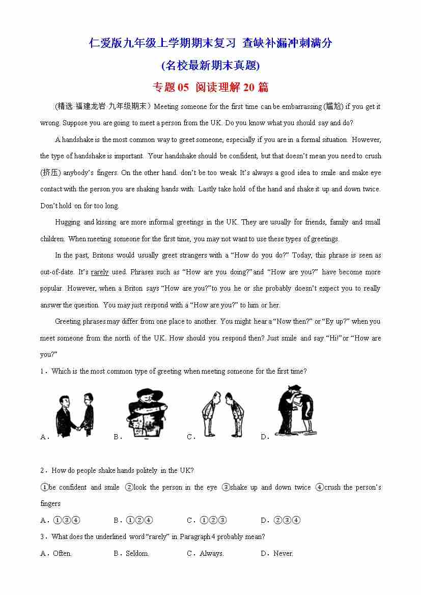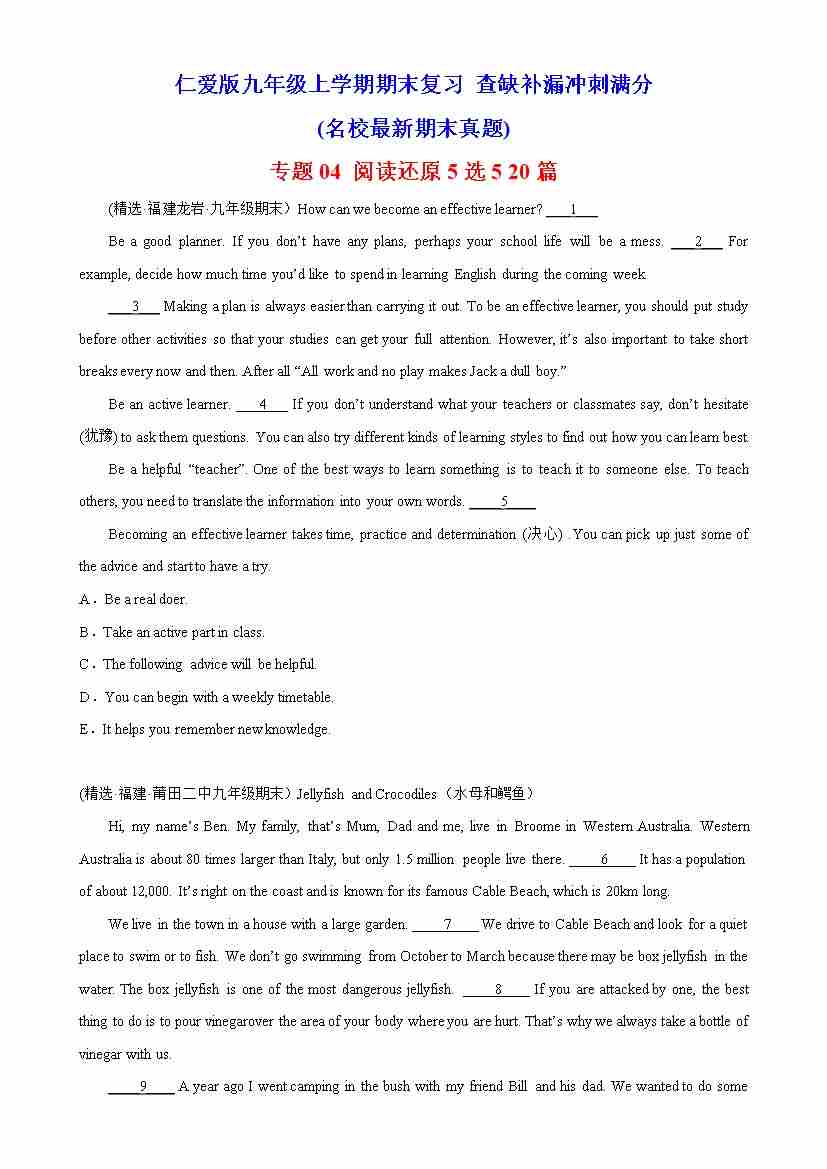 专题04 阅读还原5选5 20篇(名校最新期末真题)-九年级英语上学期期末复习查缺补漏冲刺满分(仁爱版)