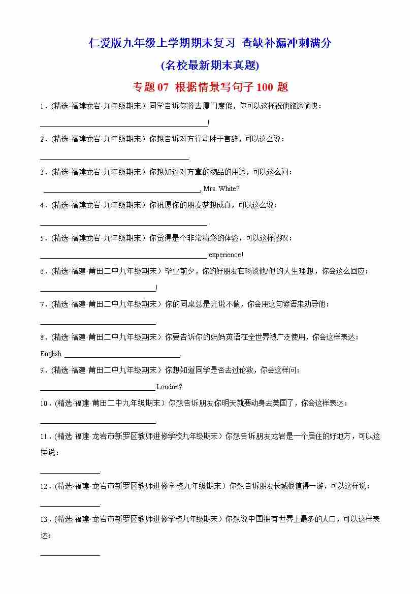 专题07 根据情景写句子100题(名校最新期末真题)-九年级英语上学期期末复习查缺补漏冲刺满分(仁爱版)