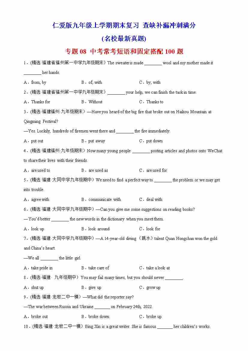专题08 中考常考短语和固定搭配100题(名校最新真题)-九年级英语上学期期末复习查缺补漏冲刺满分(仁爱版)