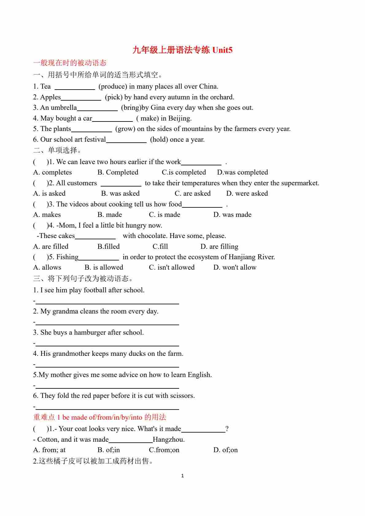 九年级语法专练Unit5