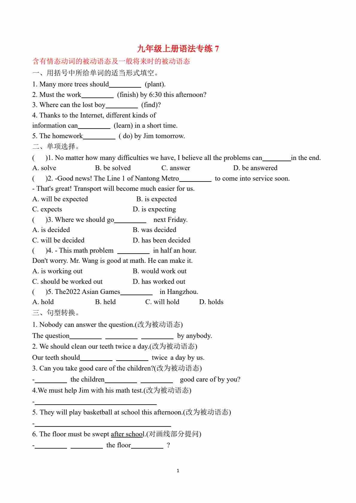 九年级语法专练Unit7