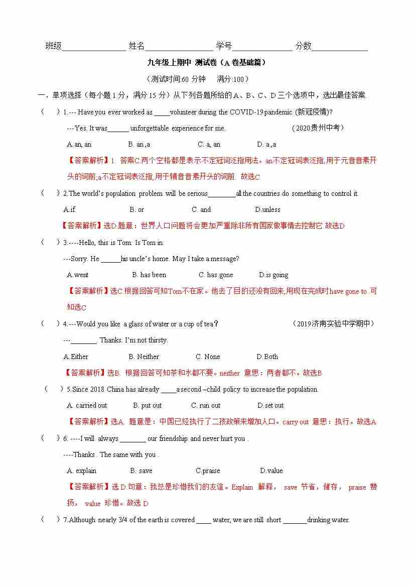 期中测试卷(A卷基础篇)(解析版)