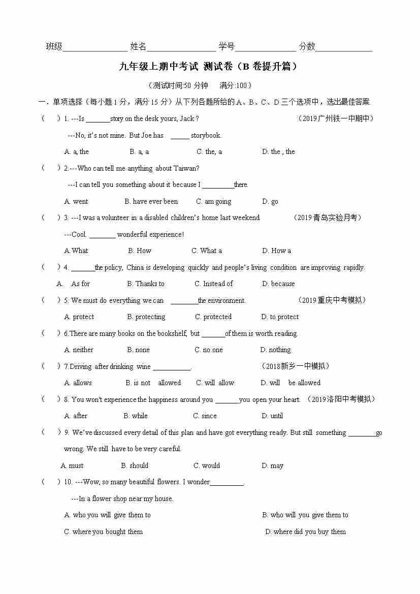 期中测试卷(B卷提升篇)(原卷版)