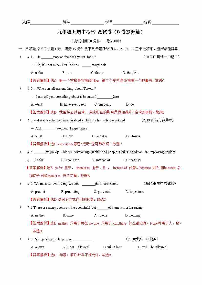 期中测试卷(B卷提升篇)(解析版)