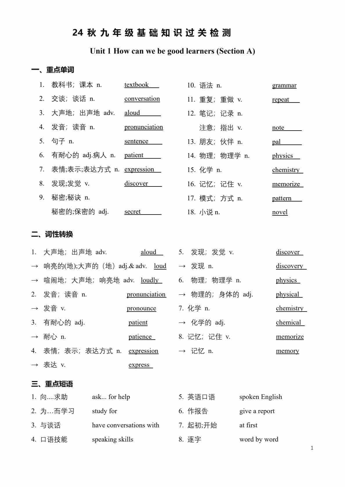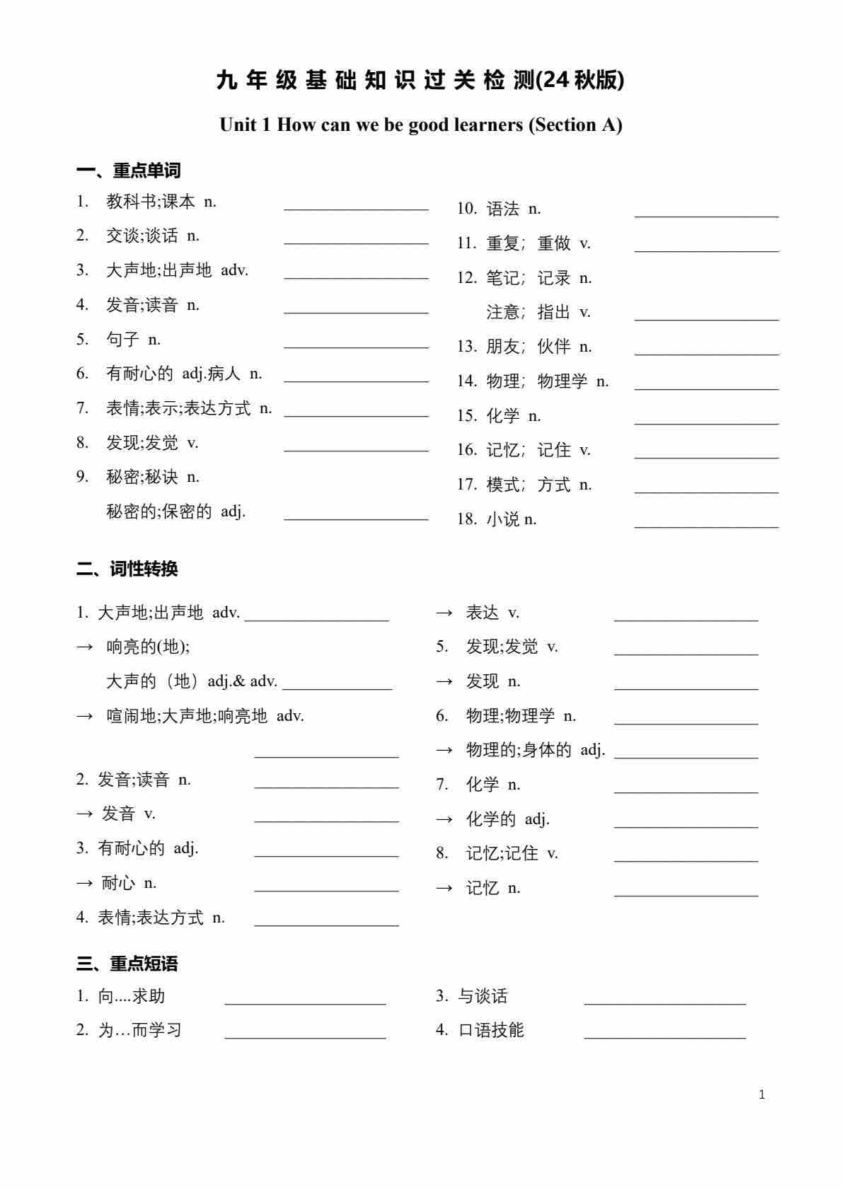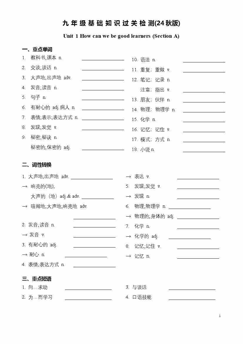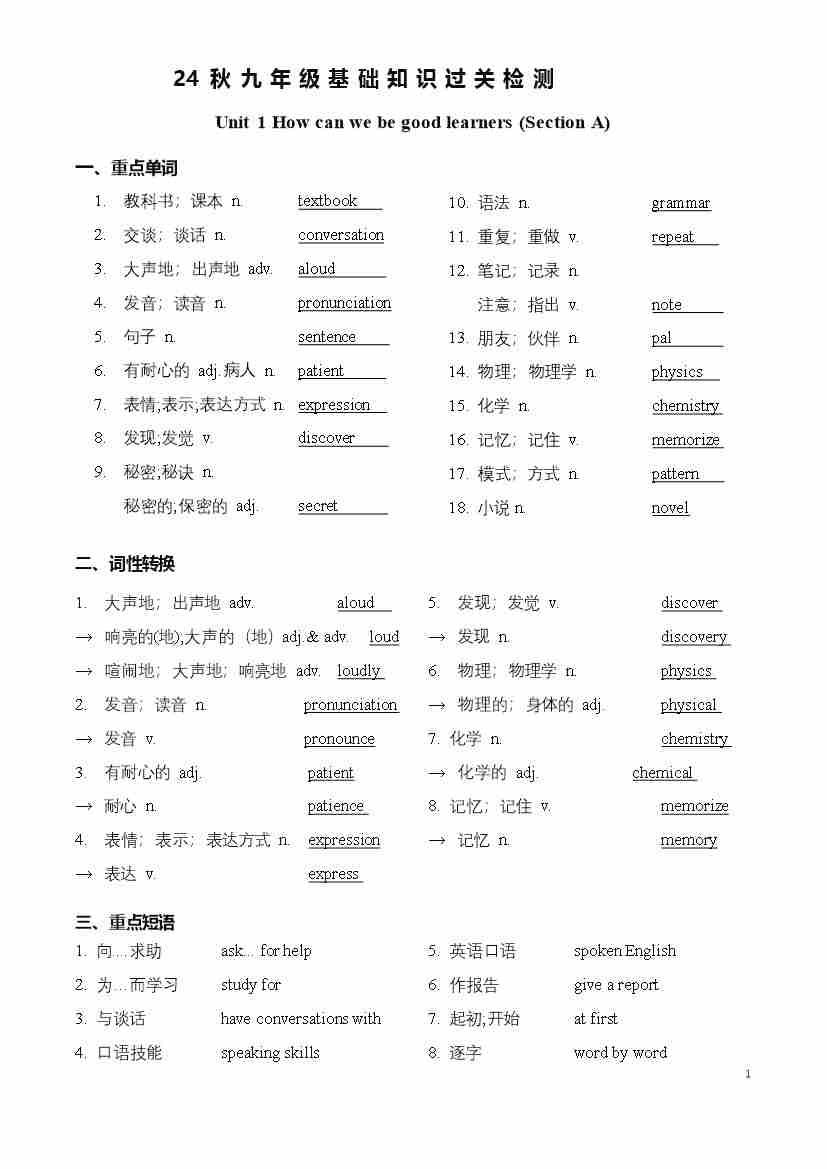 新九上词组+句子+语法 学生挖空检测版