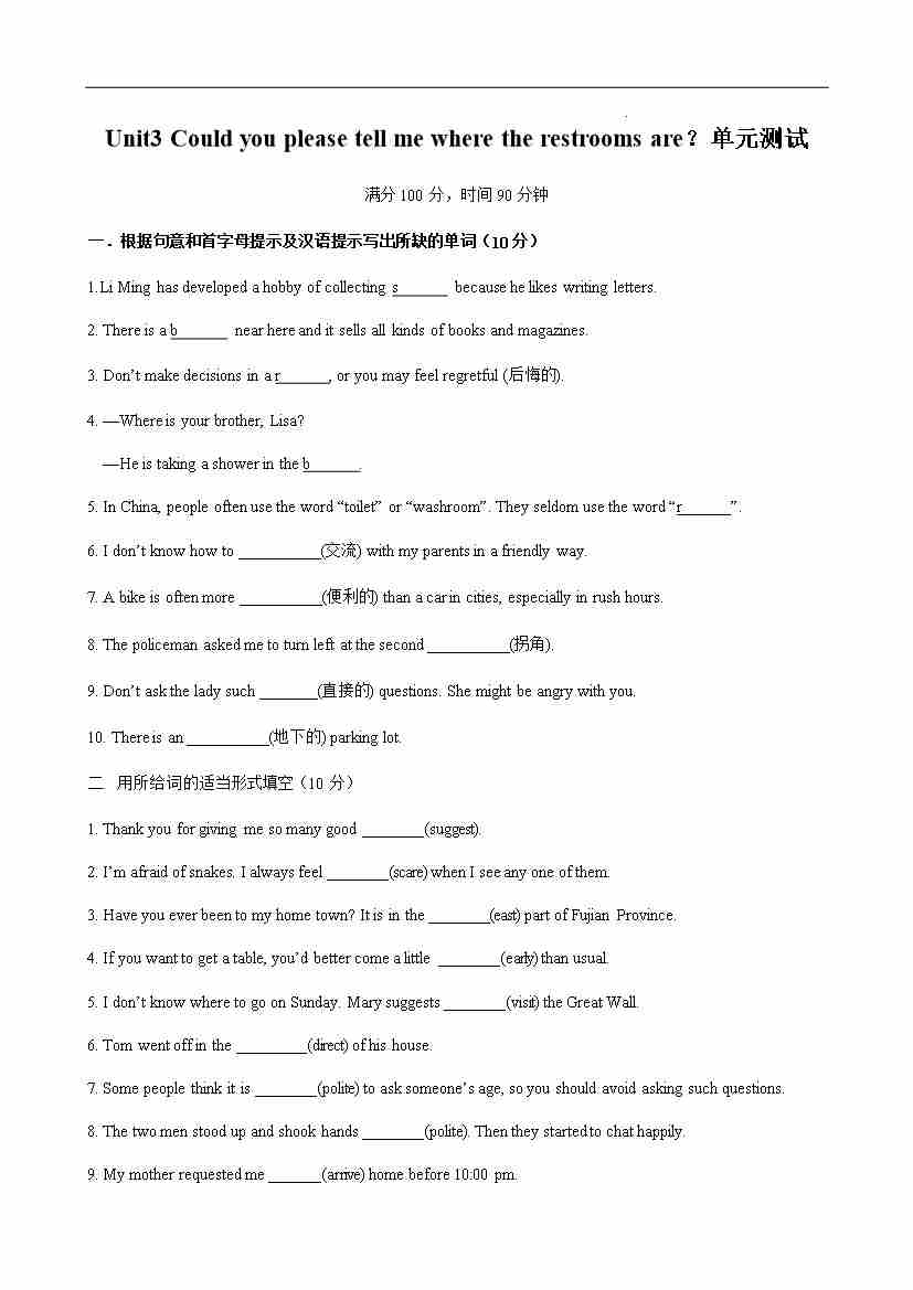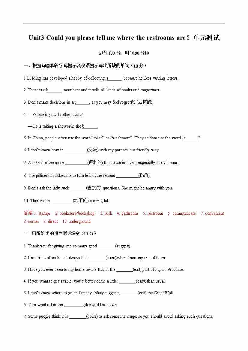 Unit3 Could you please tell me where the restrooms are?单元测试(解析版)