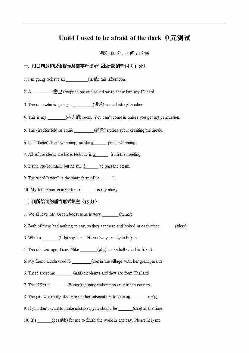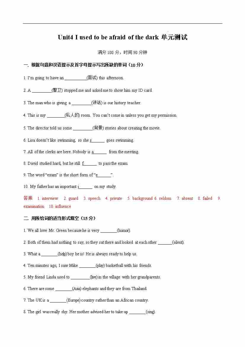 Unit4 I used to be afraid of the dark单元测试(解析版)