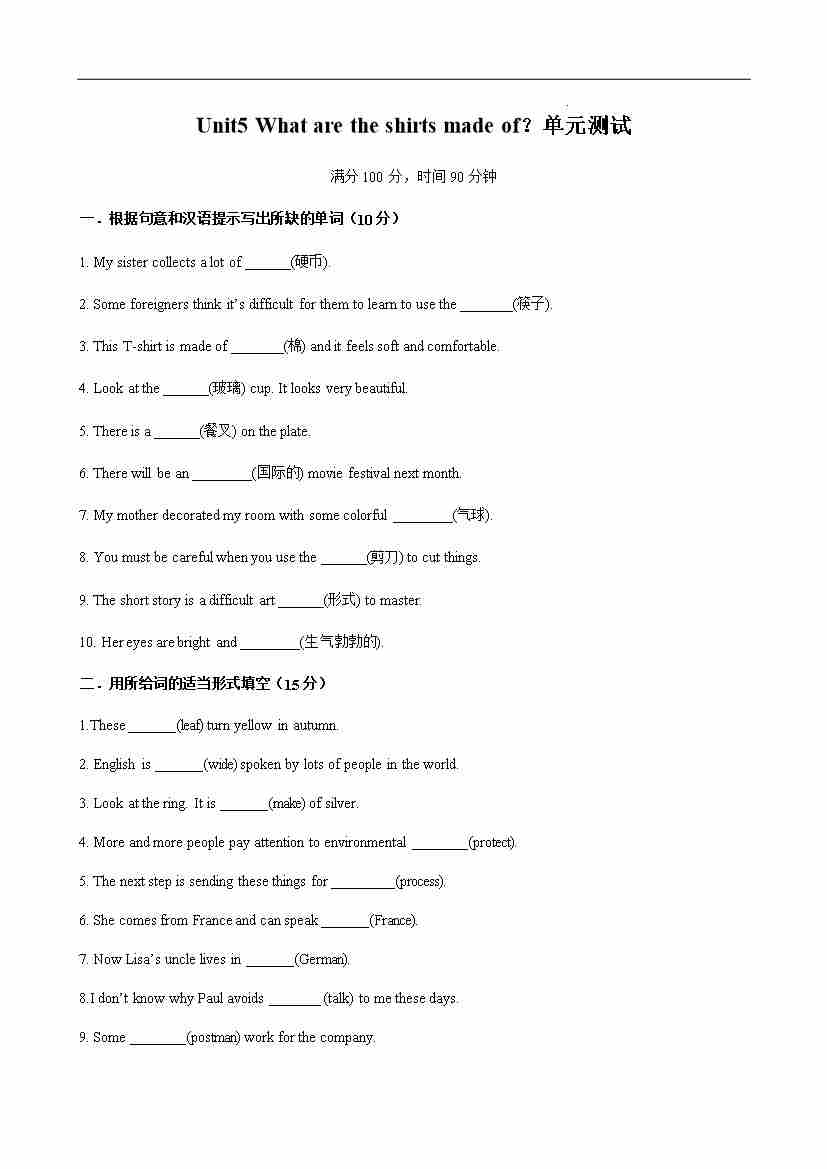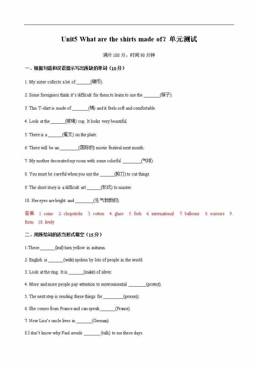 Unit5 What are the shirts made of?单元测试(原卷版)
