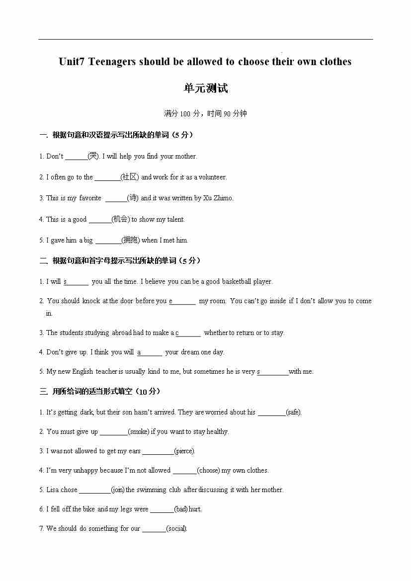 Unit7 Teenagers should be allowed to choose their own clothes单元测试(原卷版)