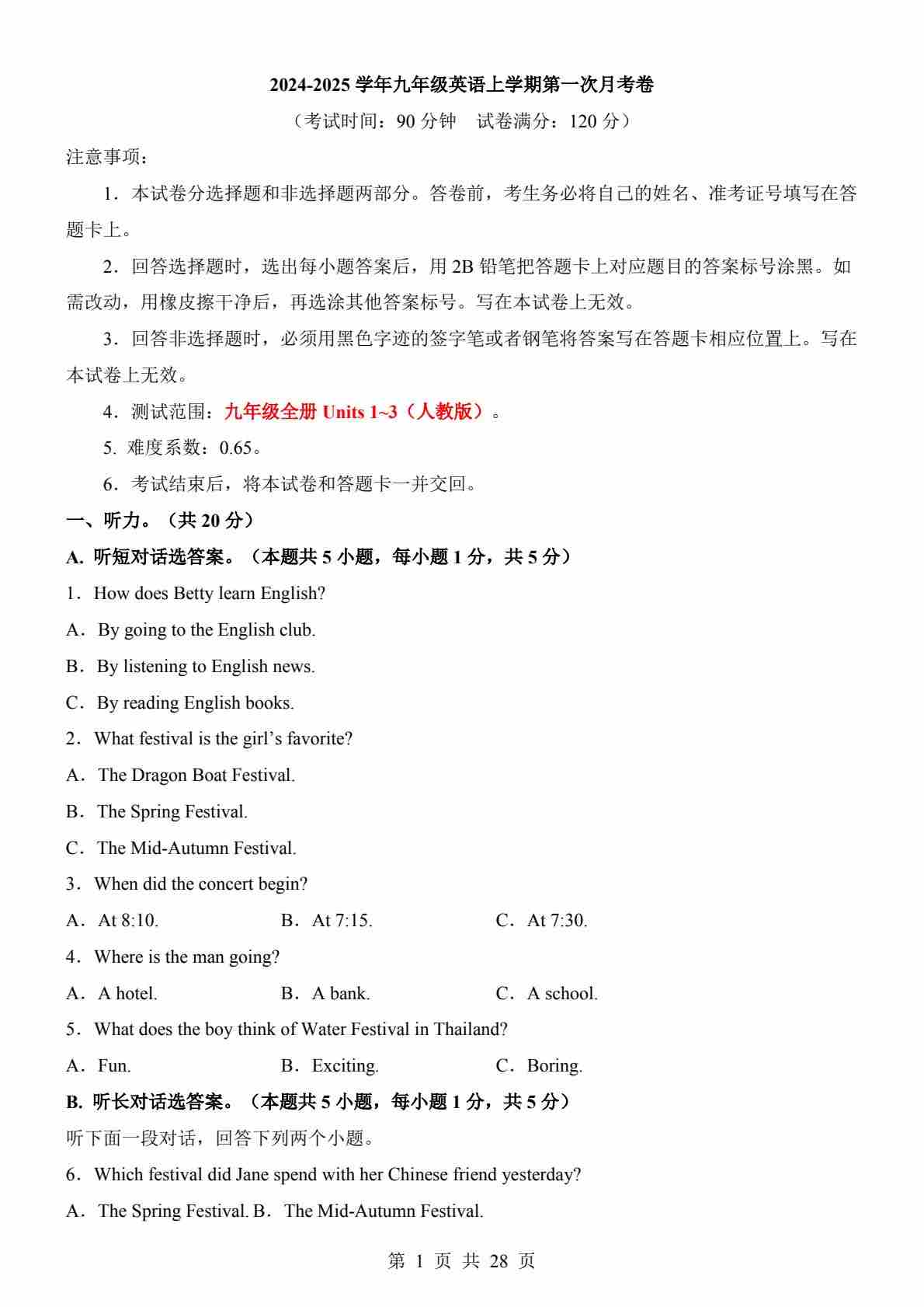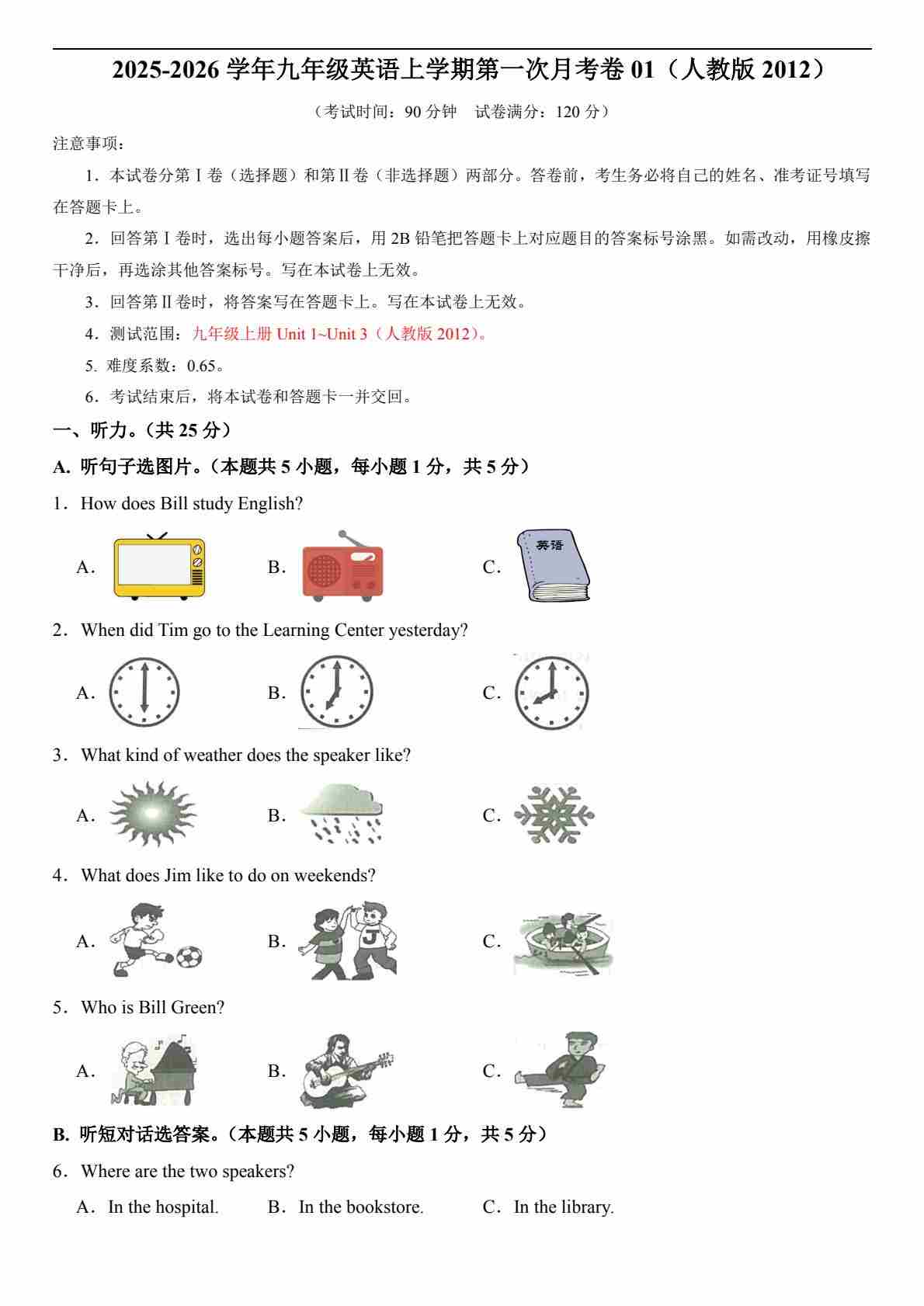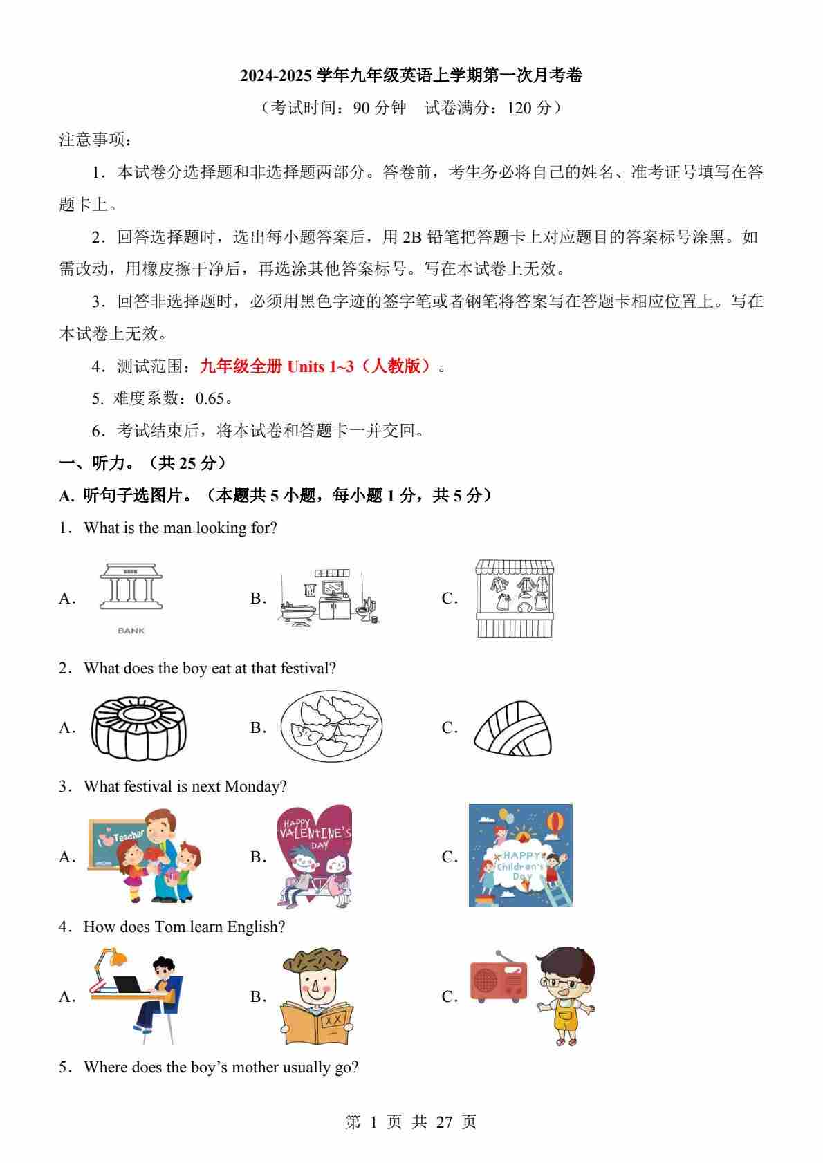 2025(人教版)九年级英语第一次月考卷01(考试版A4)【测试范围:九年级全册Unit 1~Unit 3】