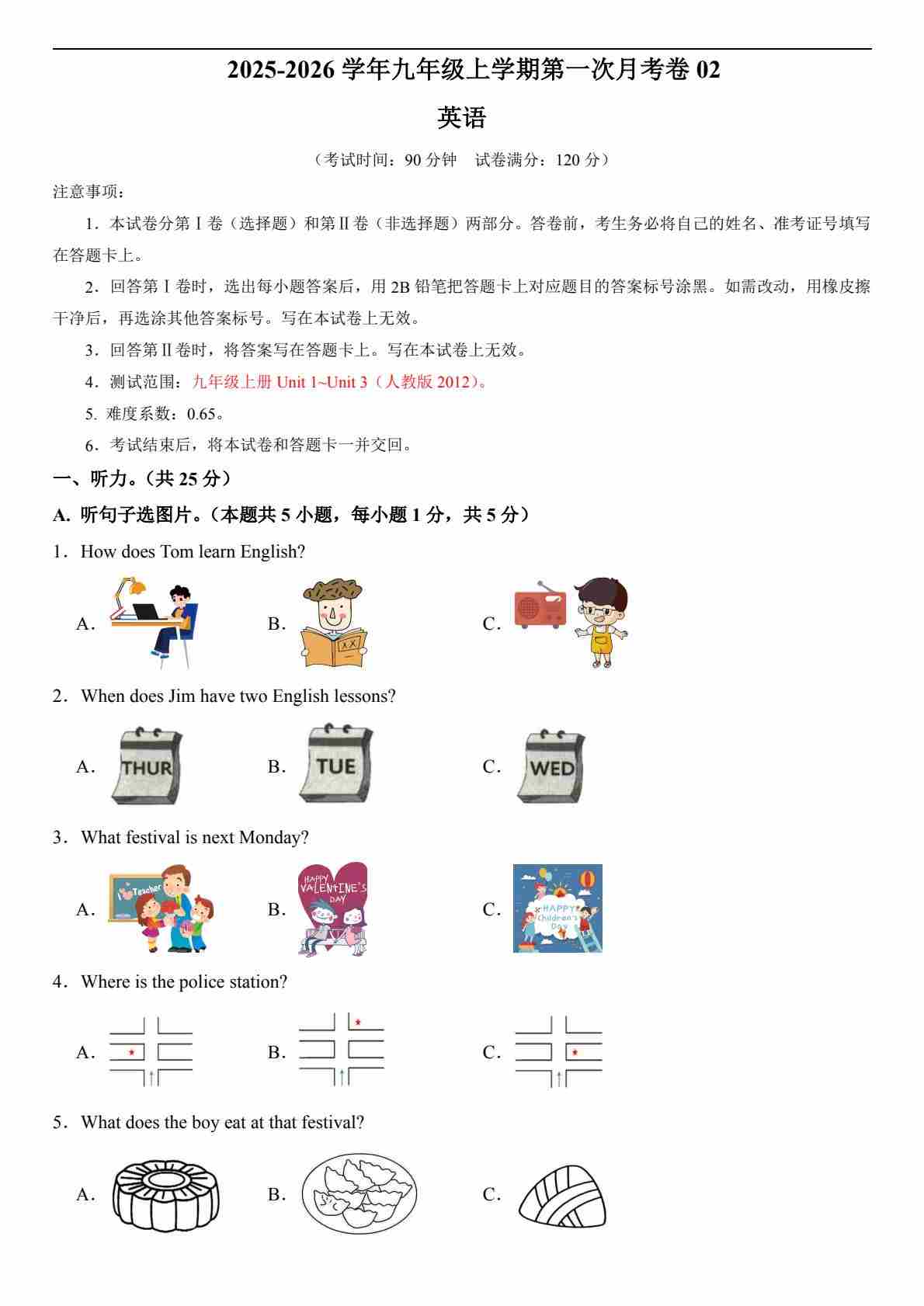 2025(人教版)九年级英语第一次月考卷02(考试版A4)【测试范围:九上Unit 1~Unit 3】