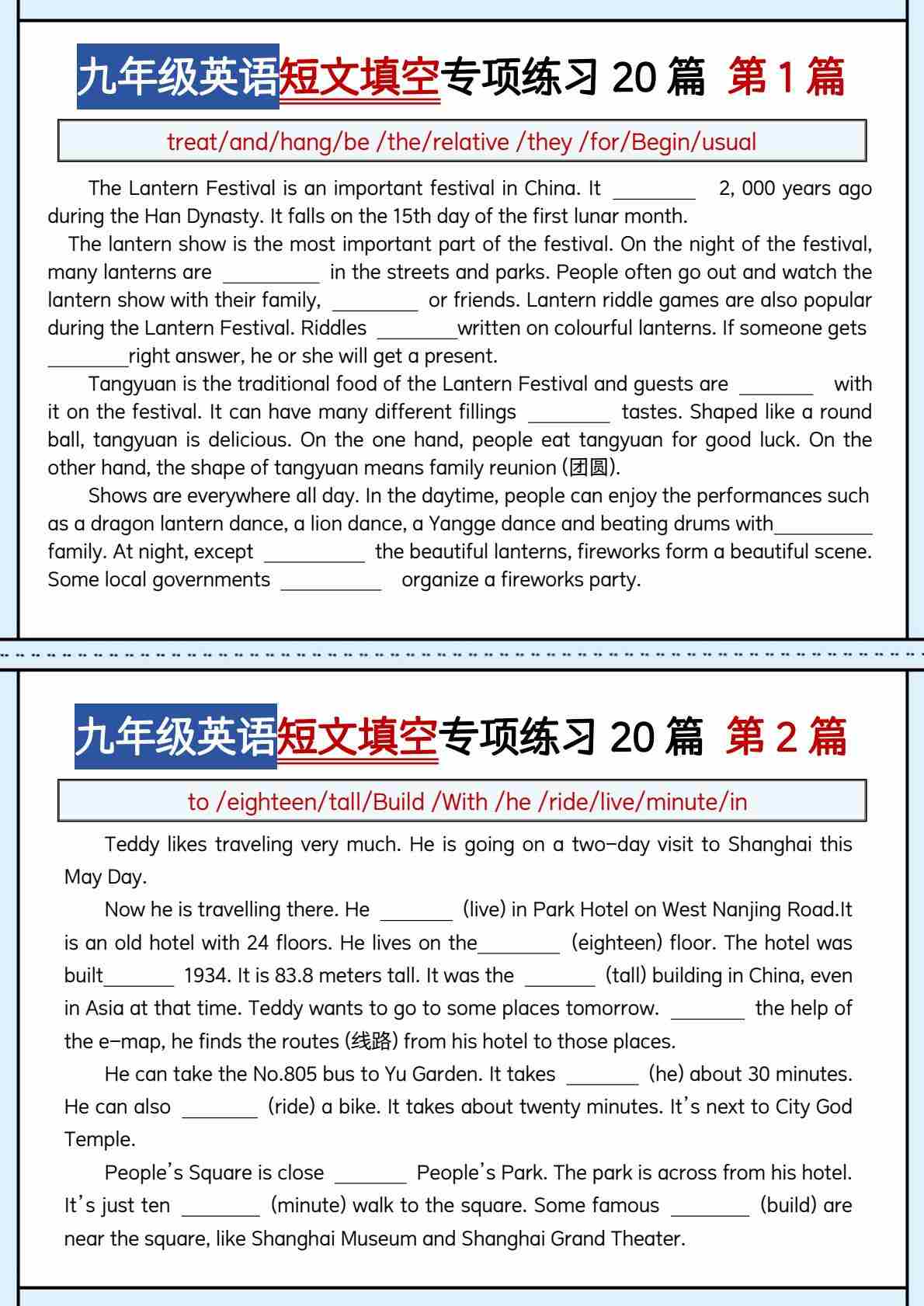 九年级英语(通用)短文填空专项小纸条20篇