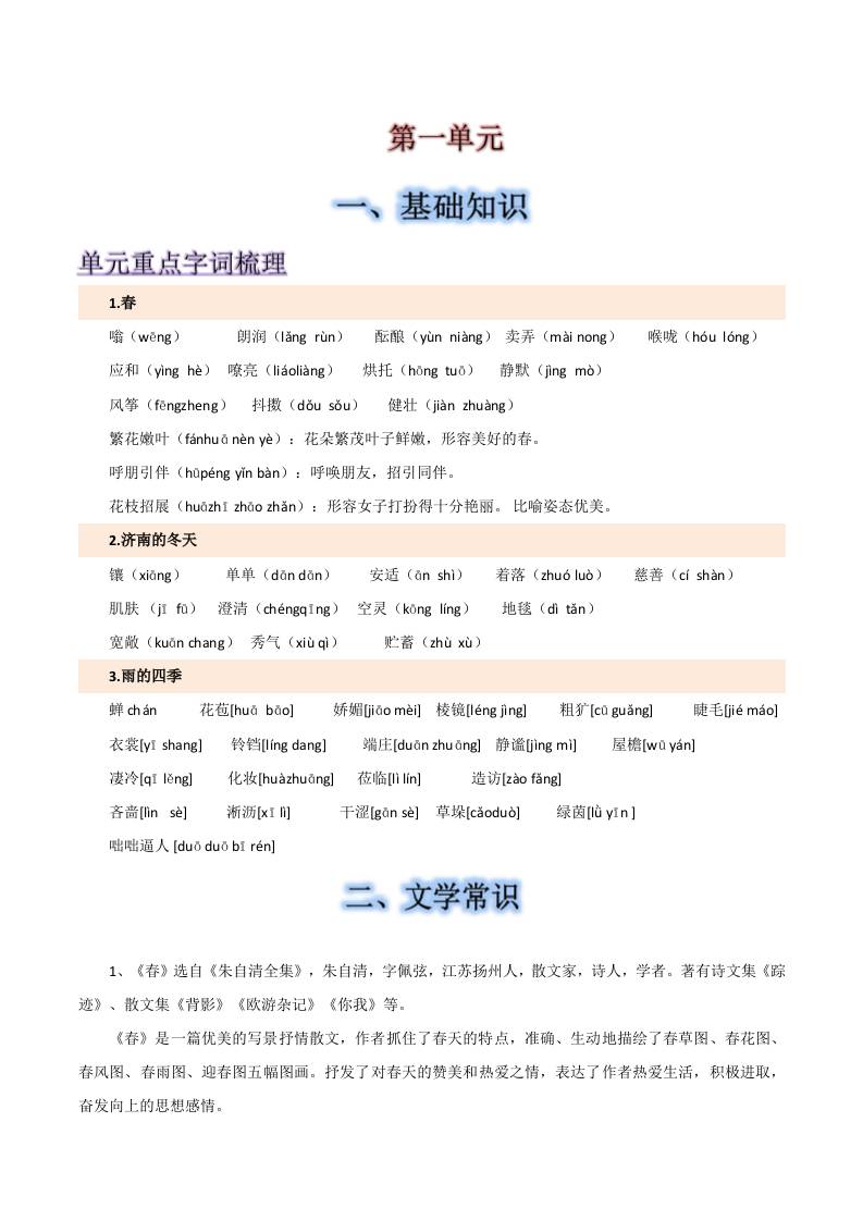第一单元-2025-2026学年七年级语文上册【速记清单】