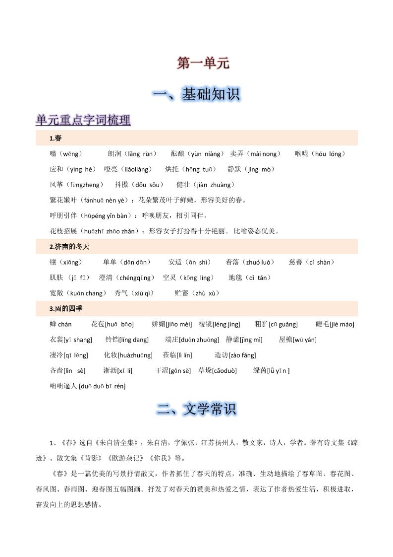 第一单元-2025-2026学年七年级语文上册【速记清单】.