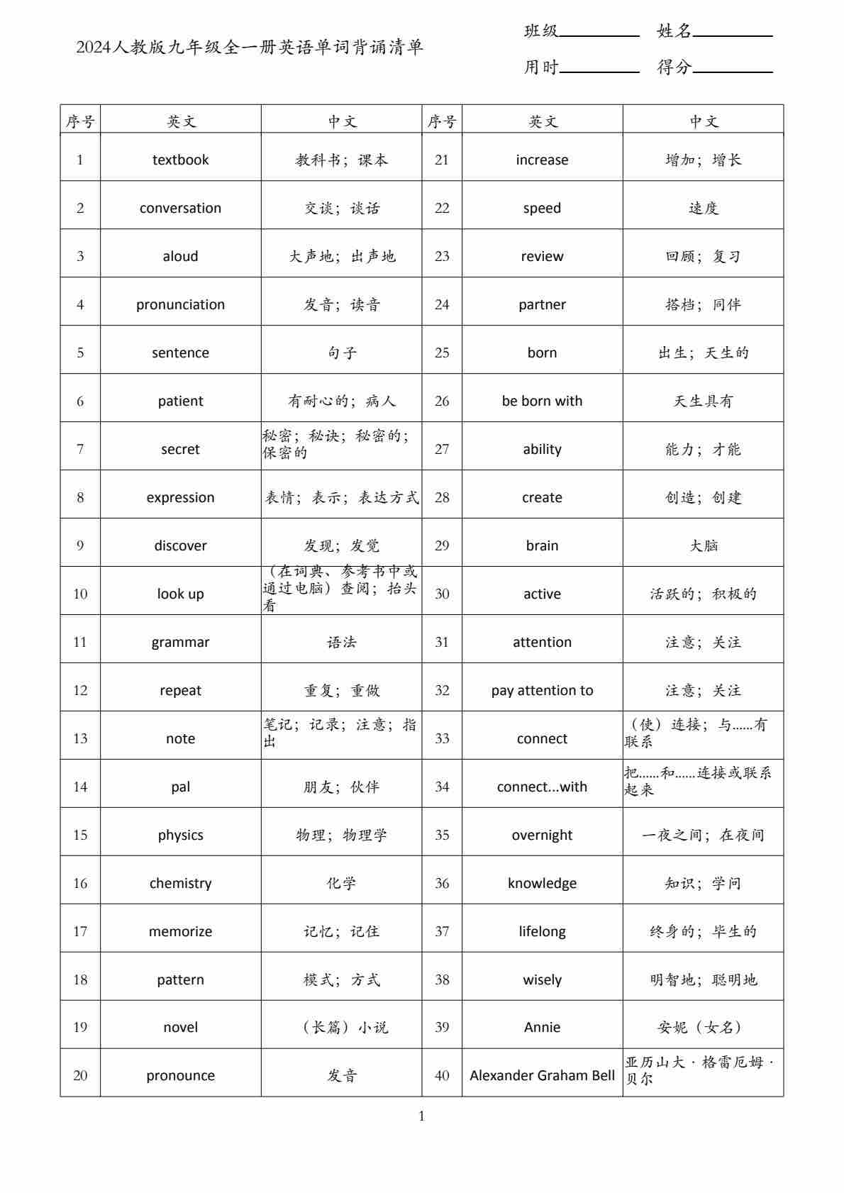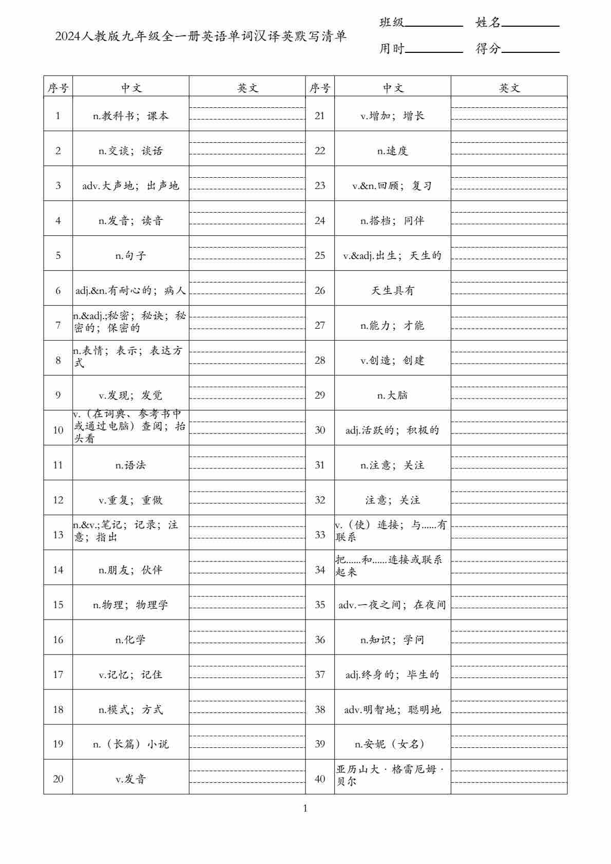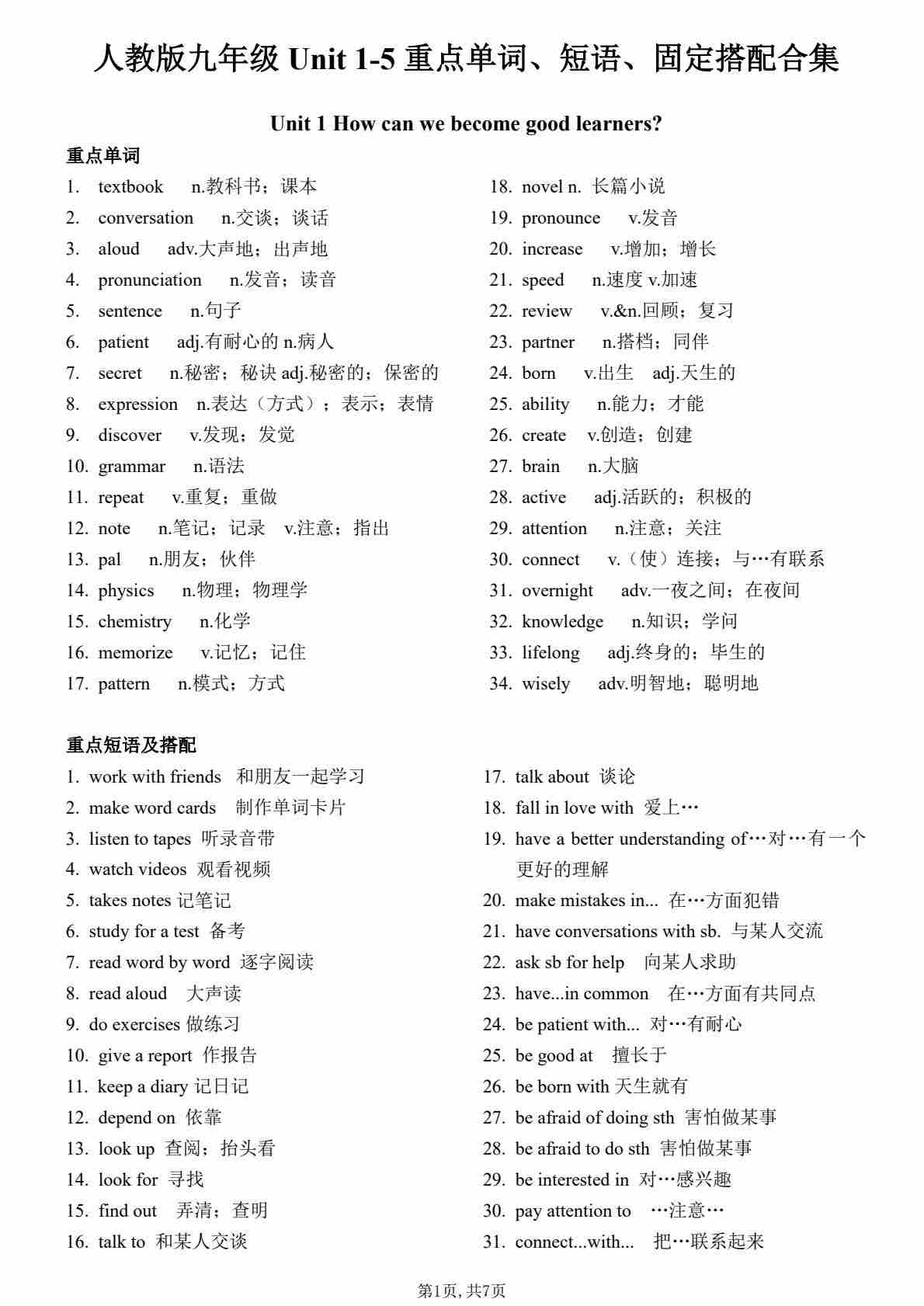 人教版九年级重点单词、短语及搭配Unit1-5更新版 背诵版