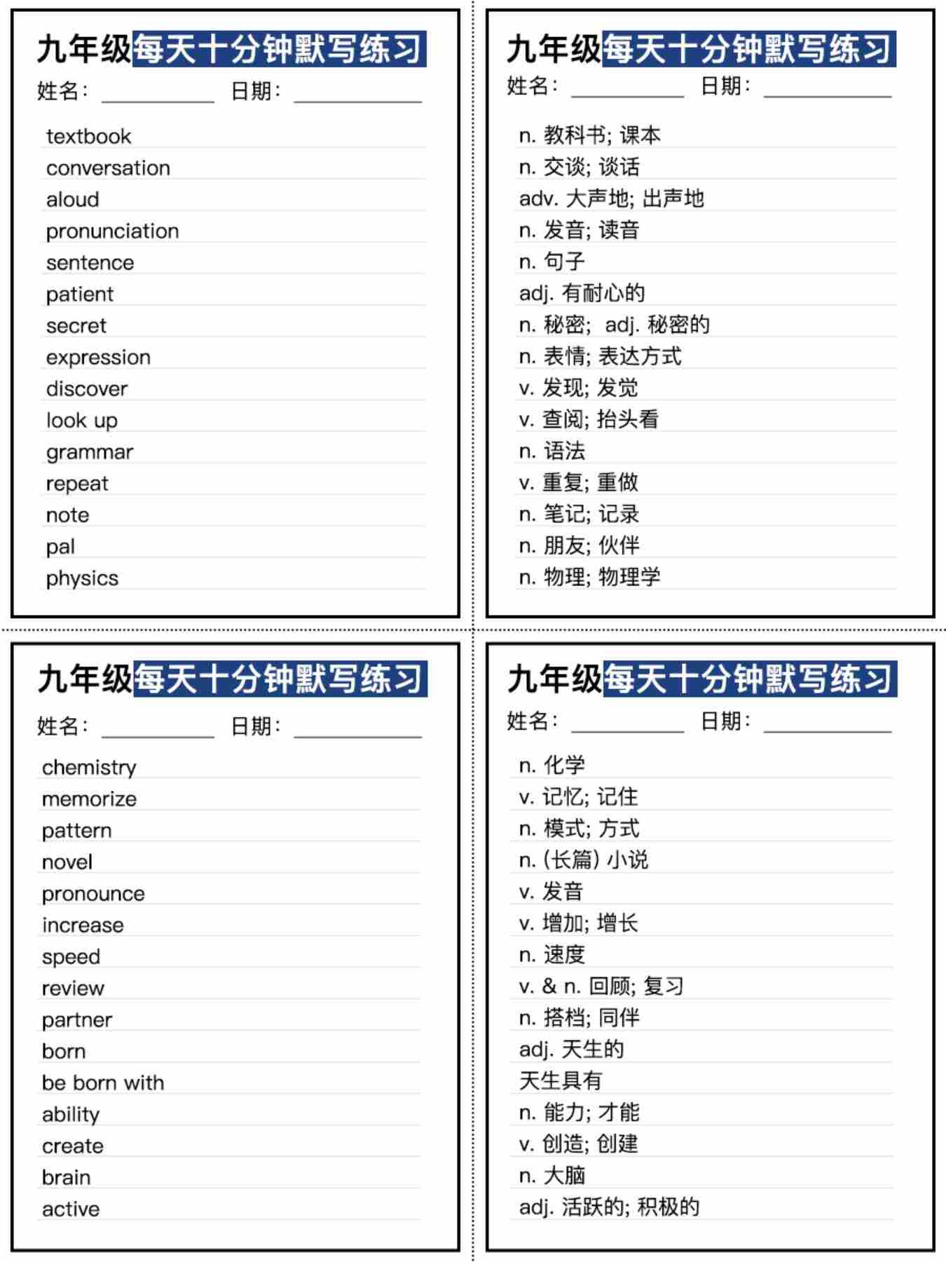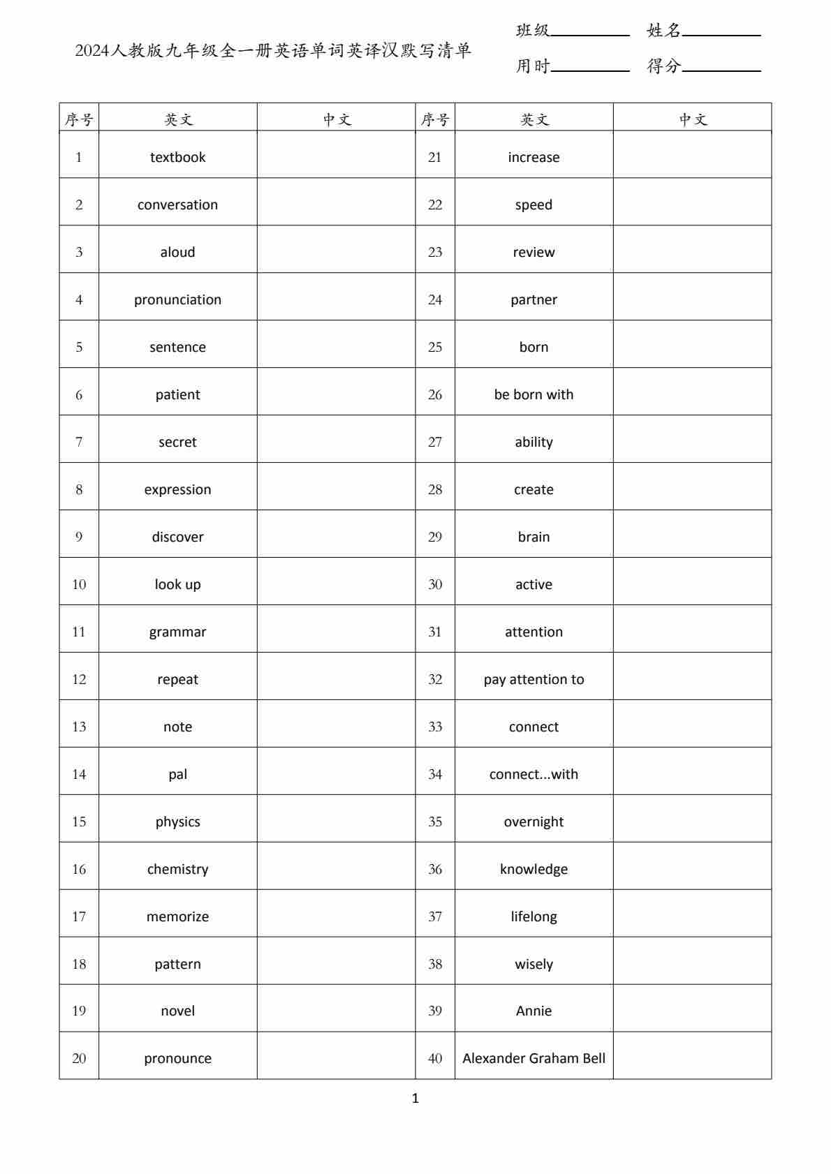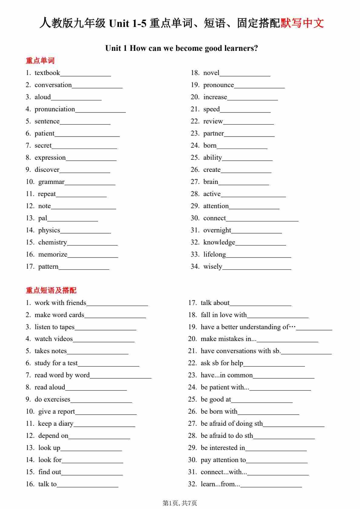 人教版九年级重点单词、短语及搭配Unit1-5默写中文
