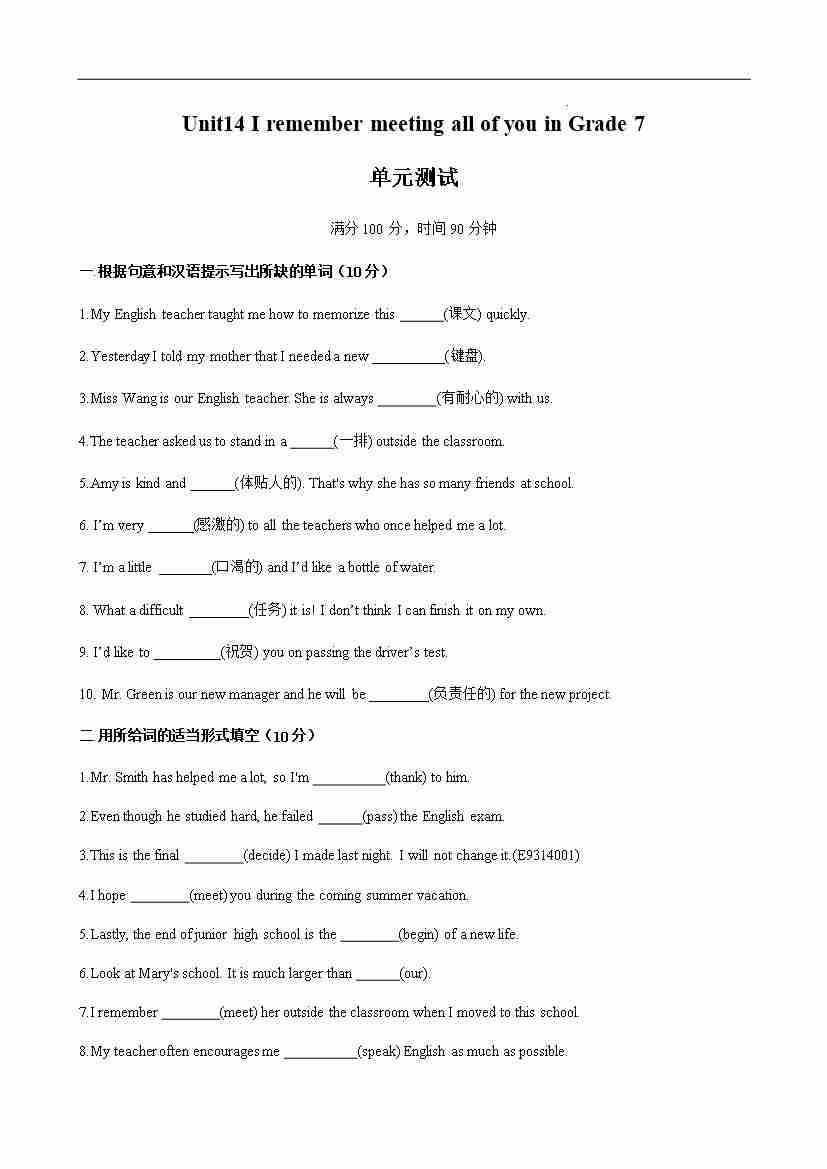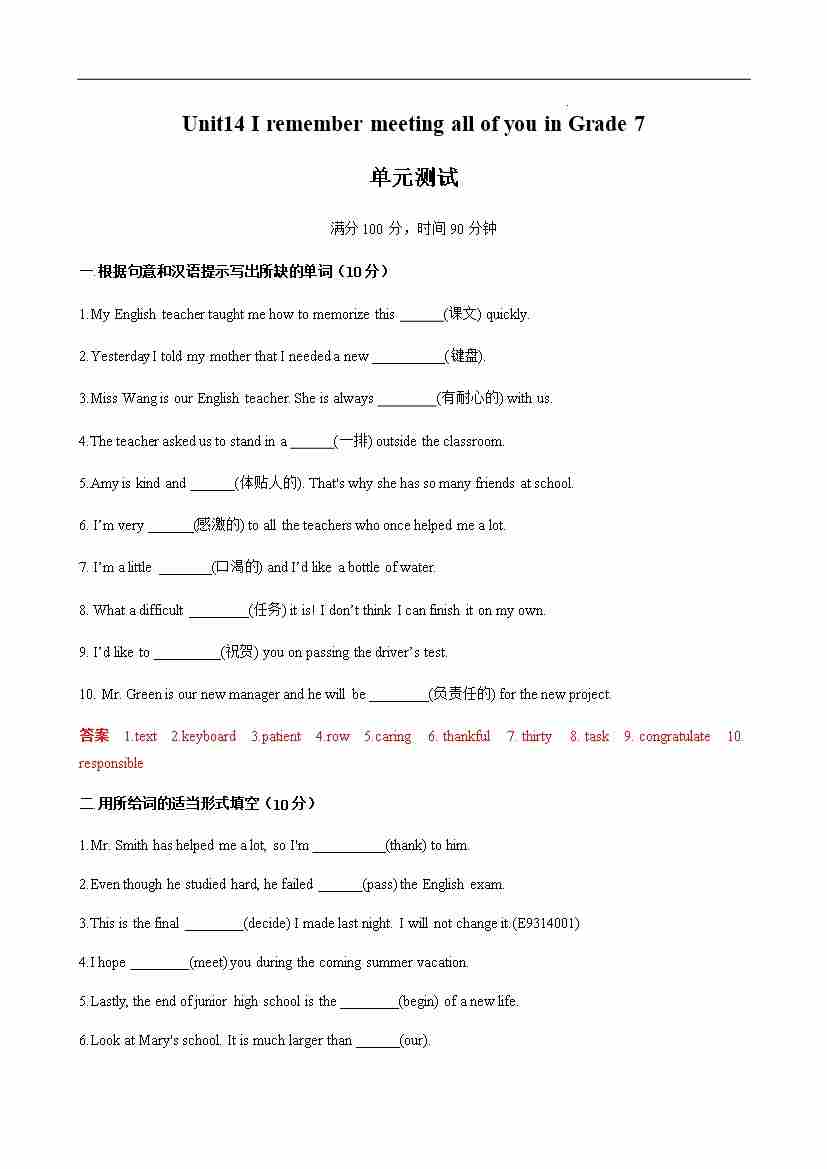 Unit14 I remember meeting all of you in Grade 7单元测试(解析版)