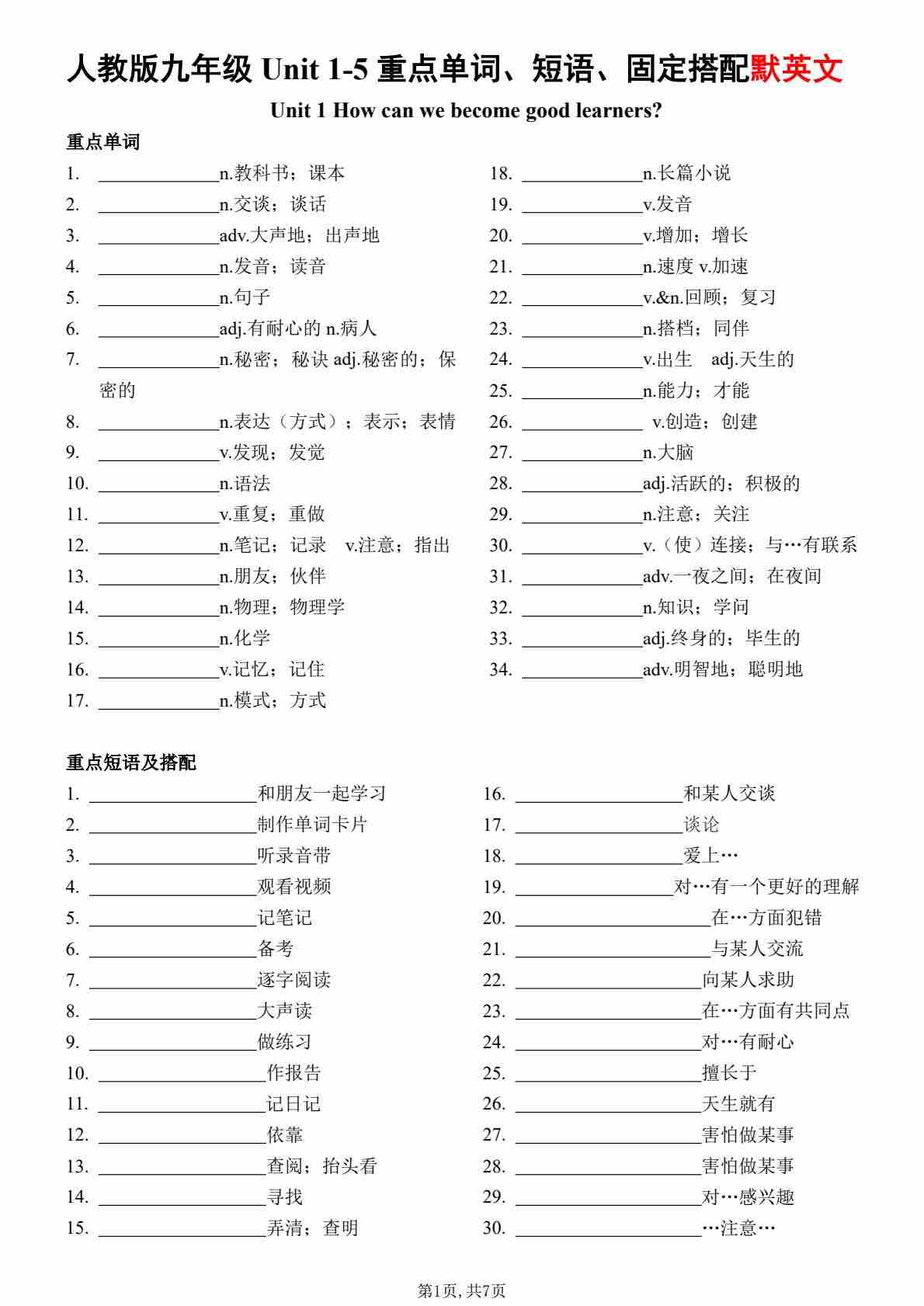人教版九年级重点单词、短语及搭配Unit1-5默英文 _