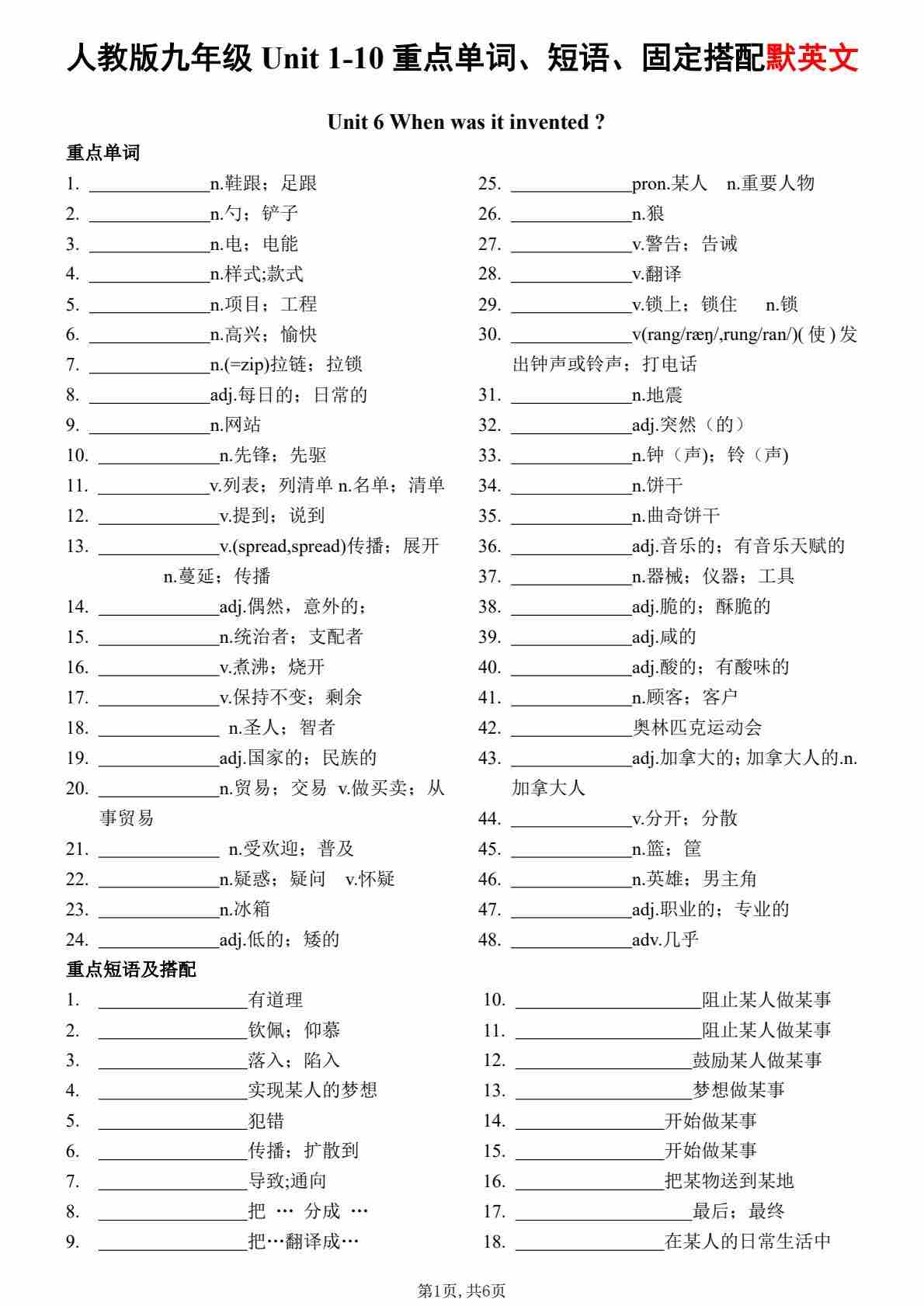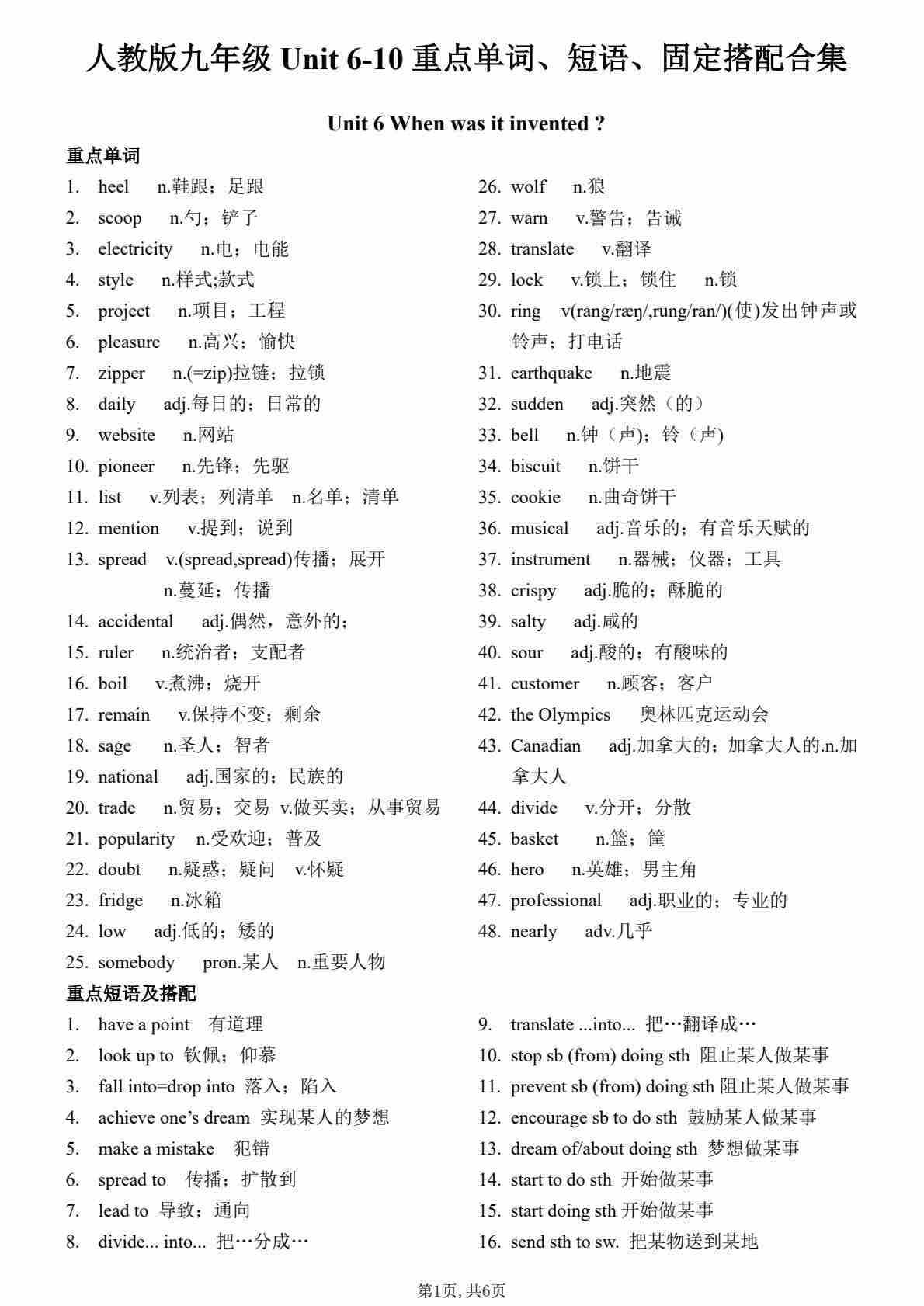 人教版九年级重点单词、短语及搭配Unit6-10更新版 背诵版 _Pas