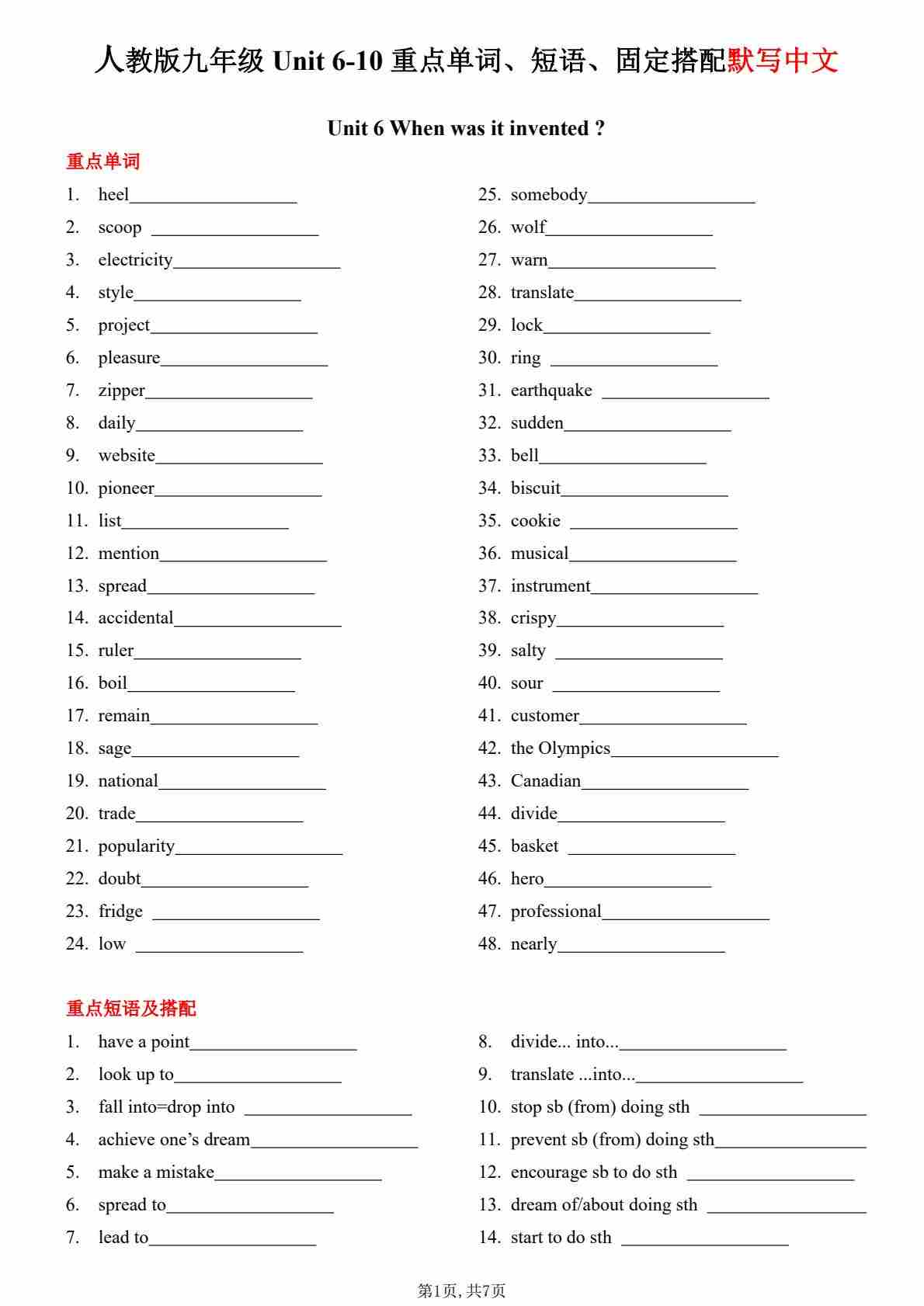 人教版九年级重点单词、短语及搭配Unit6-10默写中文 _