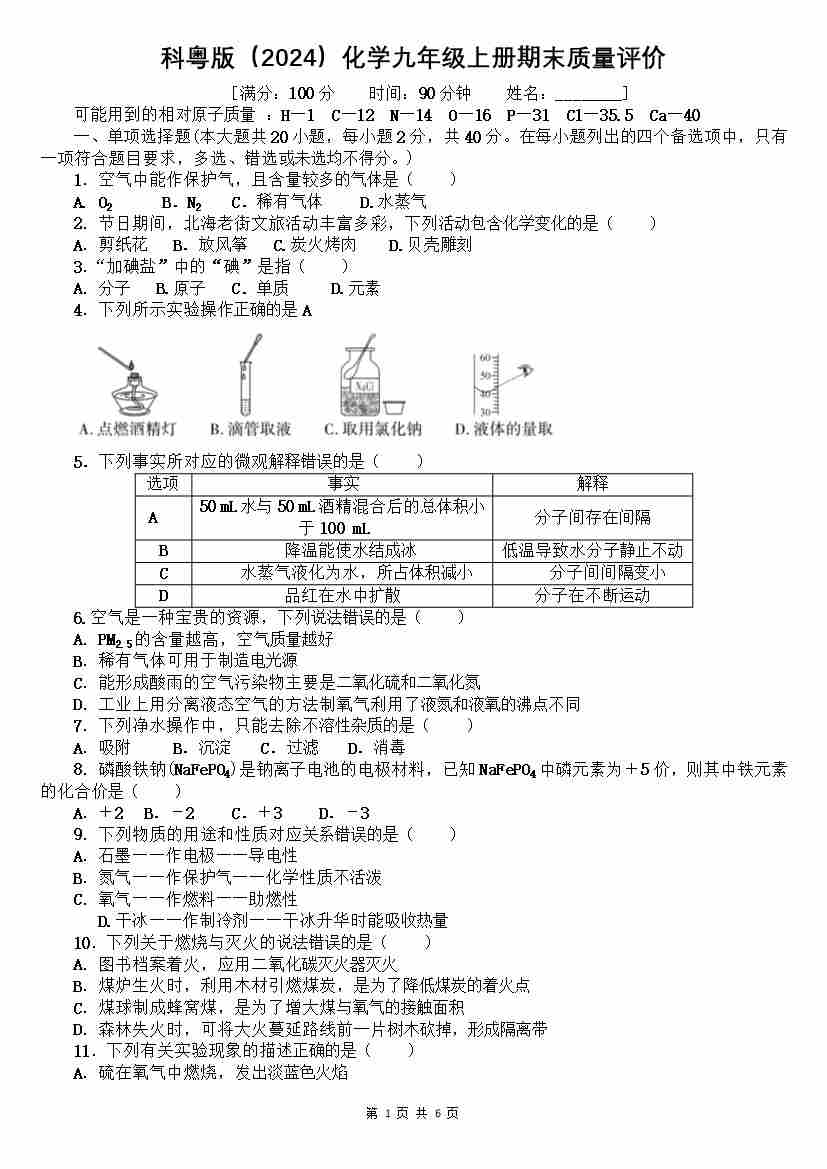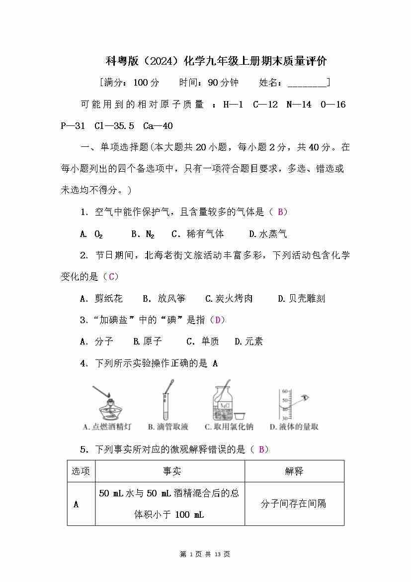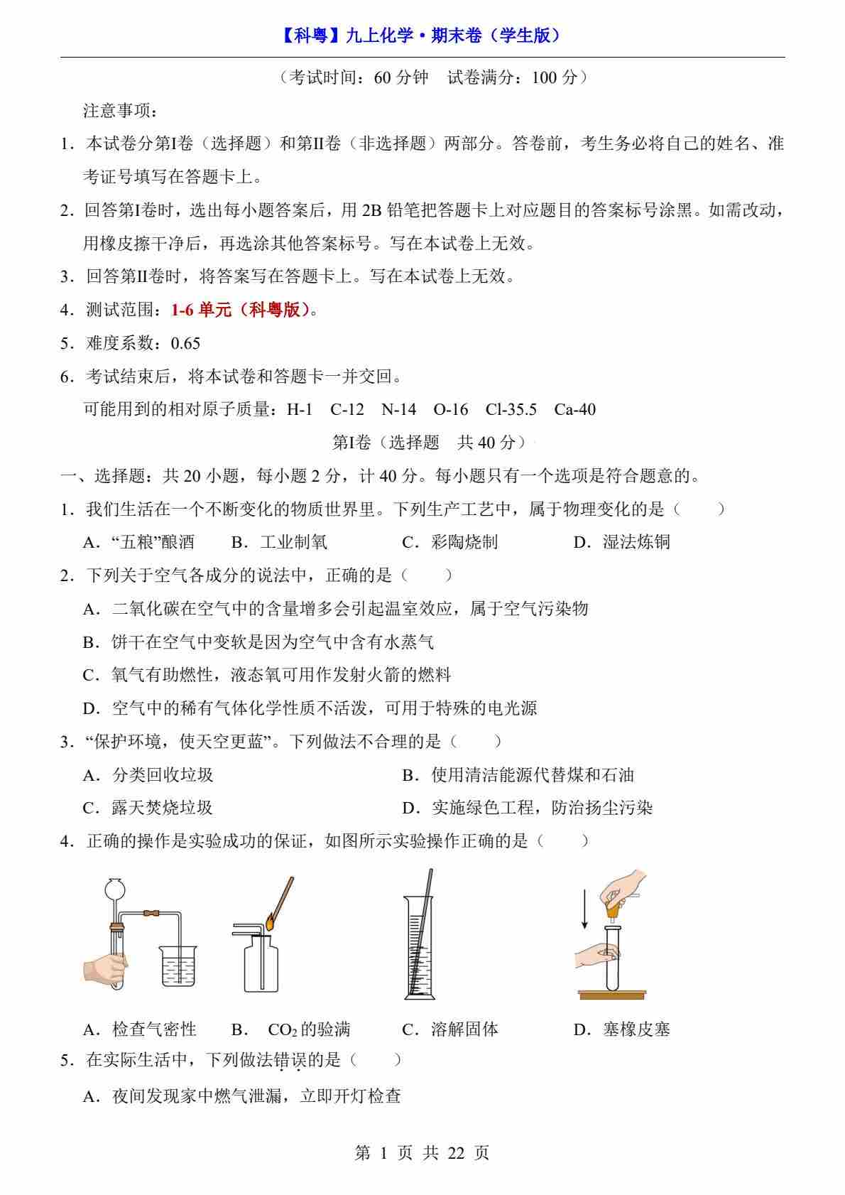 【科粤】9上化学期末卷【第1-6单元】