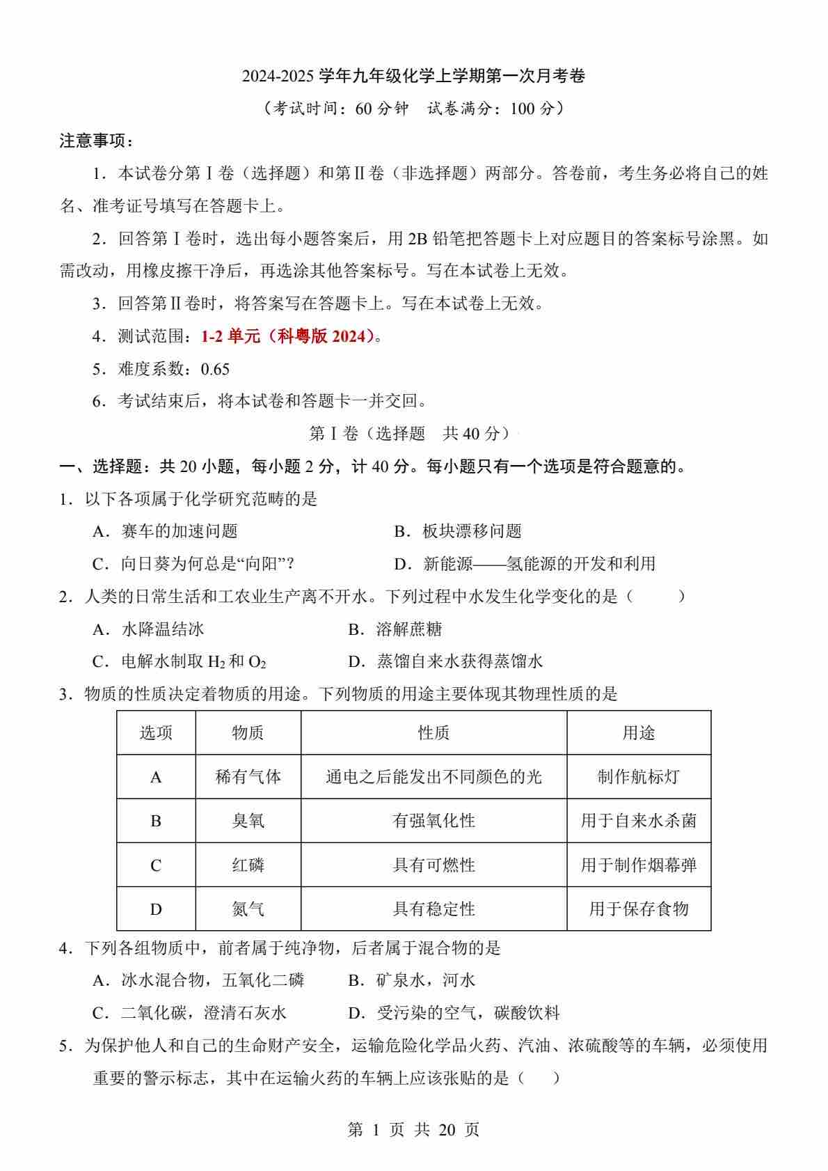 【科粤】9上化学第1次月考【第1-2单元】-