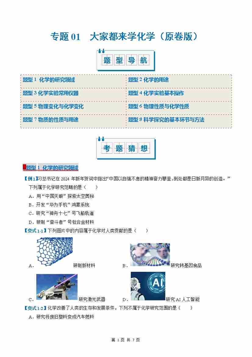 专题01 大家都来学化学(考题猜想)(8大题型)(原卷版)
